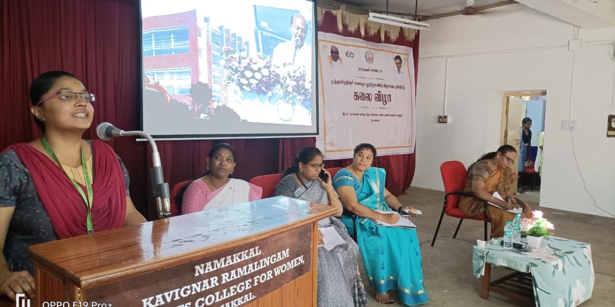 On the occasion of the 100th birth anniversary (centenary birth day celebrations) of Dr. Kalaignar M. Karunanithi (former Chief Minister of Tamil Nadu), the department of Tamil Development, Namakkal, conducted an elocution competition titled “Kalaignar Thoughts in Social Justice” (கலைஞரின் சமூக நீதி கருத்துகள்) on January 11, 2024, in the premises of Namakkal Kavignar Ramalingam Government Arts College for Women, Namakkal. On this subject, Ms. S.P. Sri Sakthi Samaya Sankari, second year B.A., English, has procured the first prize, and she got a Rs. 10000/- (ten thousand only) check from the chief guests. Dr. R.P. Bhuvaneswari, Associate Professor and Head, Department of Economics; Dr. G. Sharmila Banu, Associate Professor and Head, Department of Zoology; and the senior faculty members of Namakkal Kavignar Ramalingam Government Arts College for Women, Namakkal, were the judges of that event. Dr. T. Geetha, Assistant Professor in Tamil at Trinity College for Women, Namakkal, was the caretaker.