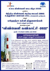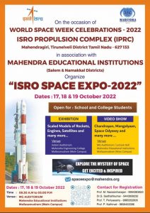 On the occasion of world space week celebration – 2002, ISRO propulsion complex (IPRC), Mahendragiri, Tirunelveli District, Tamil Nadu state in association with Mahendra Educational Institutions (Salem and Namakkal Districts) organized ‘ISRO SPACE EXPO 2022” from 17.10.2022 tp 19.10.2022. It was held in the premises of MC Auditorium, Mahendra Educational Institutions (Main Campus), Mallasamudram, Namakkal District.