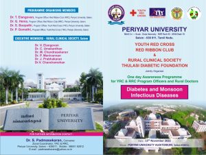 The Youth Red Cross & Red Ribbon Club of Periyar University, Salem & Rural Clinical Society Thulasi Diabetic Foundation, Salem jointly organized a one day awareness programme for YRC & RRC program officers and rural doctors in the title of “Diabetes and Monsoon Infectious Diseases” on 13th November 2022.