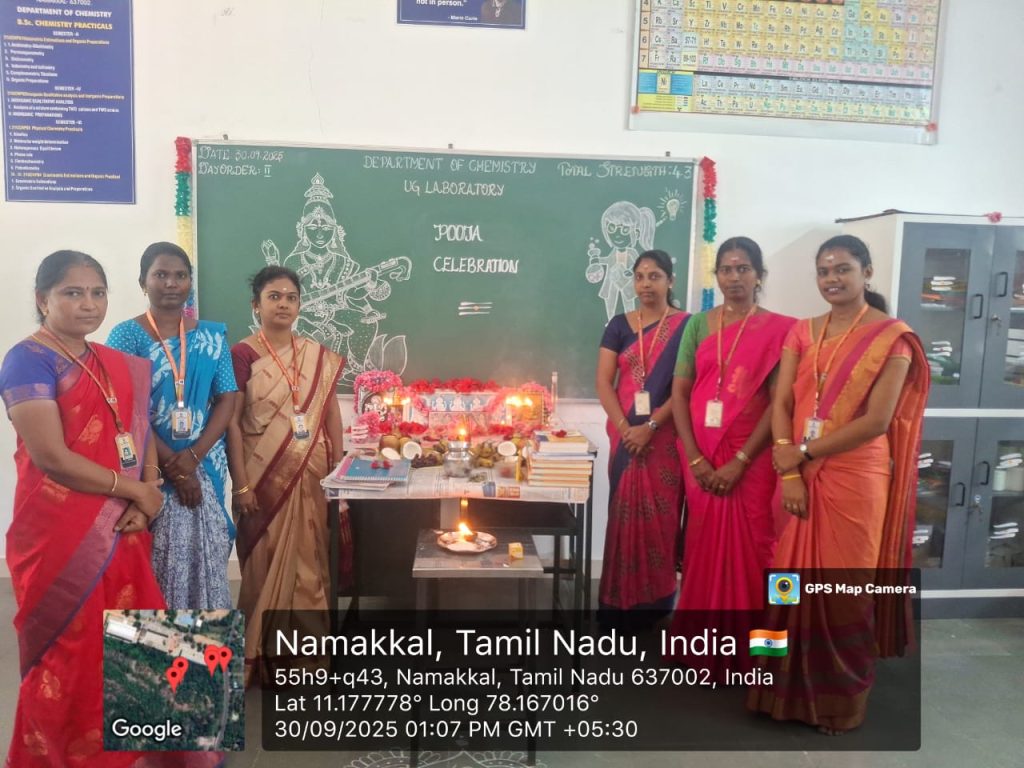 Previously (On 360th September) , the Ayudha Pooja Celebration was held in the college laboratory, library and classrooms.   All the heads of departments, faculty members, non-teaching staff members and students participated in those Ayudha  Pooja Celebrations.