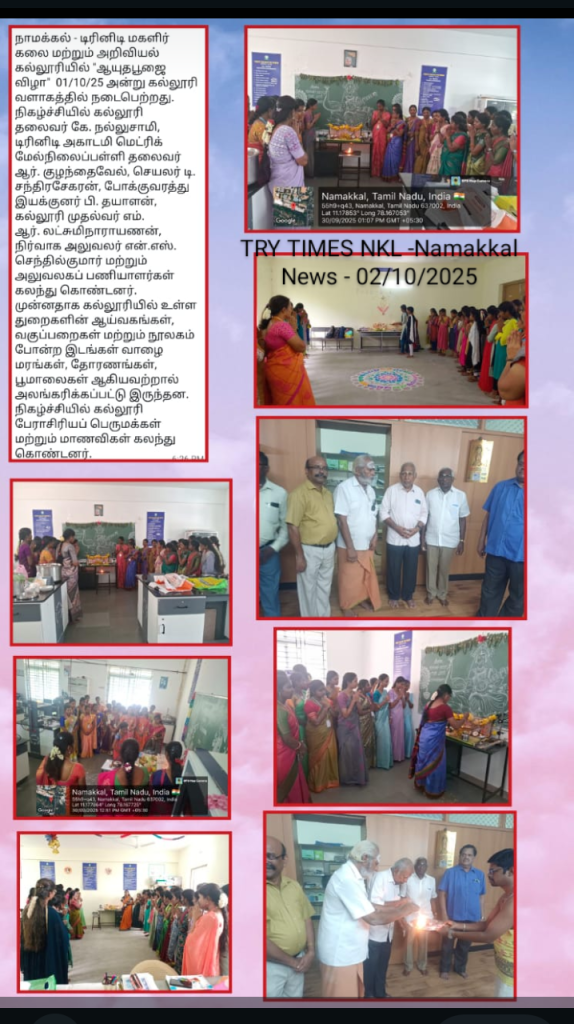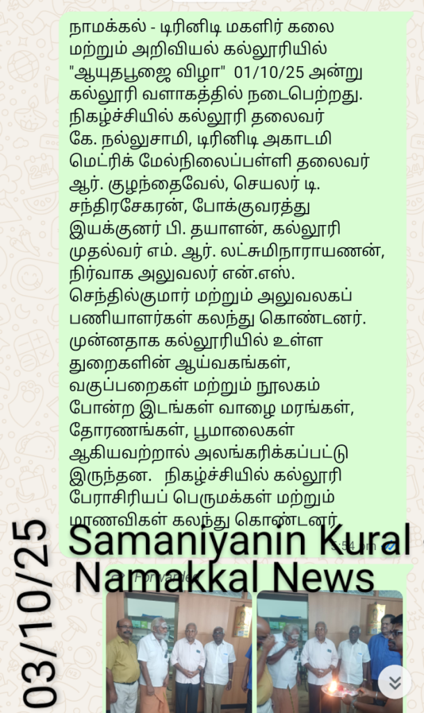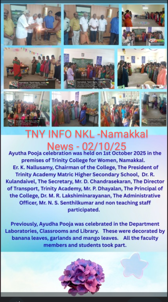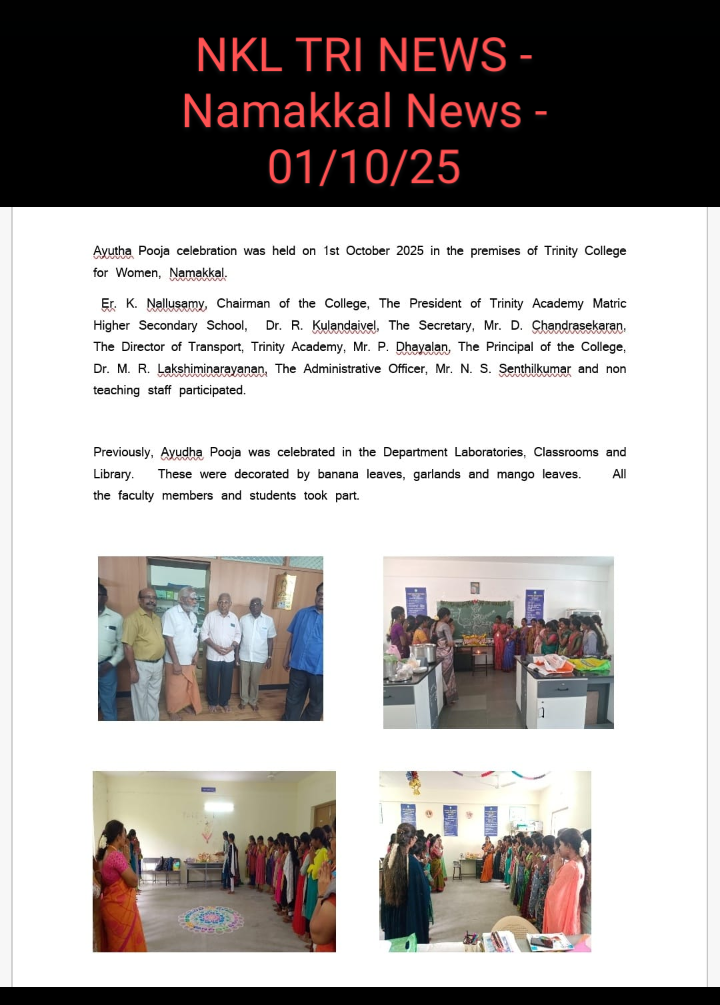 Our Trinity College for Women, Namakkal, celebrated Ayutha Pooja on 01st October 2025 in the college premises.    On this special day, all the laboratories, library, classrooms and offices were beautified with mango leaves, plantain trees and glazing papers followed by a special pooja in the presence of Er. K Nallusamy, Chairman of the College, Dr. R. Kulandaivel, President, & Mr. D. Chandrasekaran, Secretary, Trinity Academy Matric Higher Secondary School, Namakkal and Mrs. P. Dhayalan, Transport Director, Trinity Academy Educational Institutions, Namakkal, Dr. M.R. Lakshiminarayanan, Principal, Mr. N.S. Senthilkumar, Administrative Officer and the Office staff members.