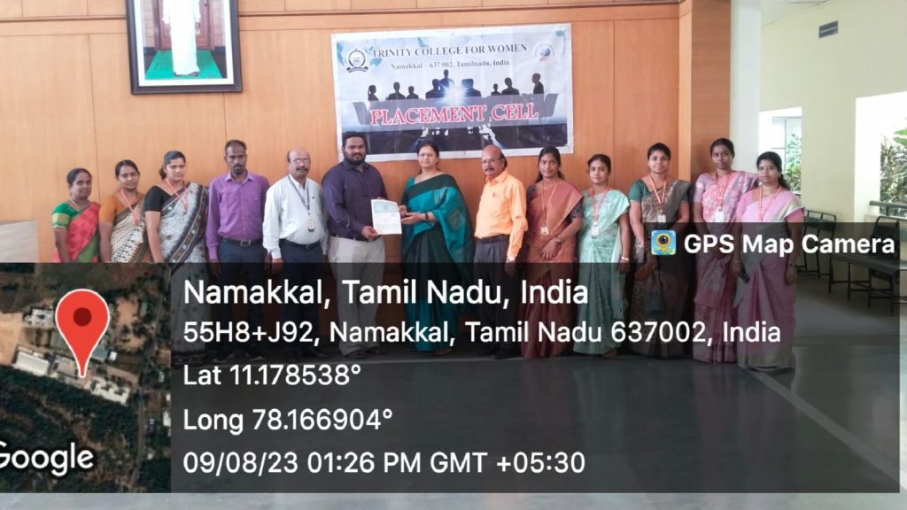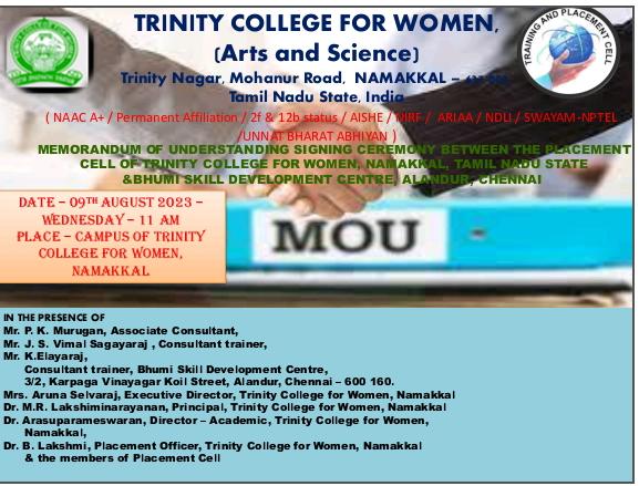 Our Trinity College for Women, Namakkal, Placement Cell has signed a Memorandum of Understandings with the organisation of “Bhumi Skill Development Centre, 3/2, Karpaga Vinayaga Koil Street, Alandur, Chennai” on 09th August 2023. The main objective of the MOU is to conduct the soft skills programme and organise the placement recruitment in our College for the sake of final year all the disciplines. In this MOU agreement function, Mrs. Aruna Selvaraj, Executive Director of the College, presided over it.