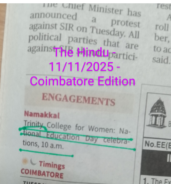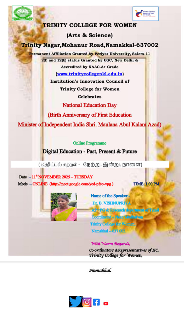 Owing to the birth anniversary of the first education Minister of Independent India, Shri. Maulana Abul Kalam Azad, The Institution’s Innovation Council, Trinity College for Women, Namakkal celebrated the National Education Day on 11th November 2025. It was held through the platform of Google Meet.