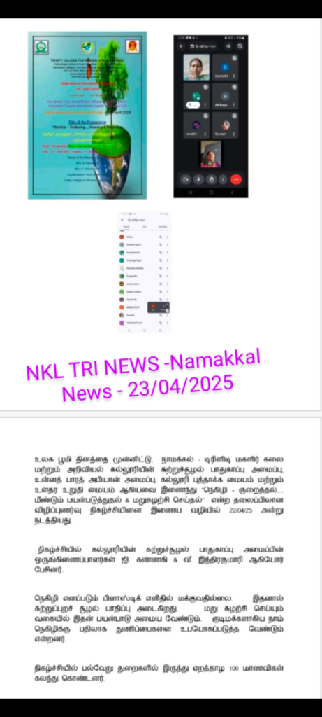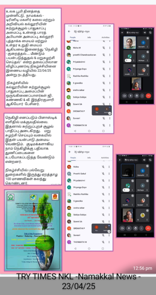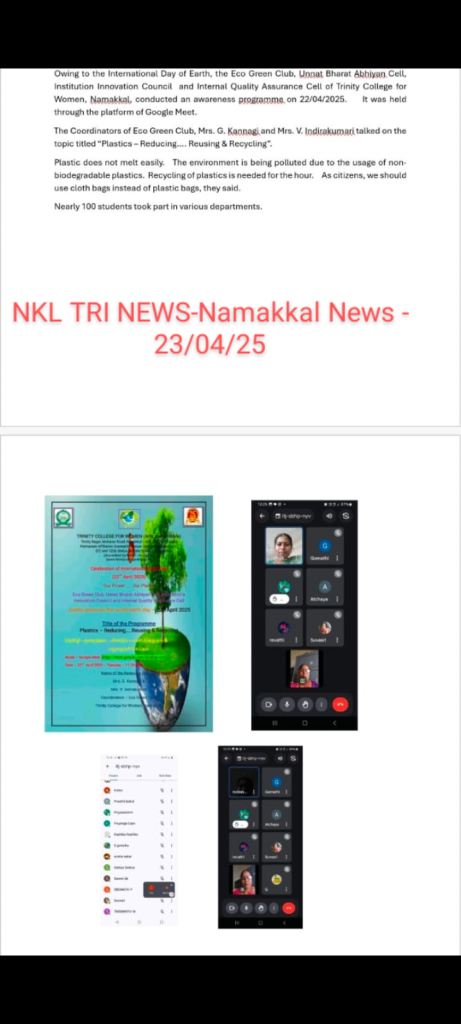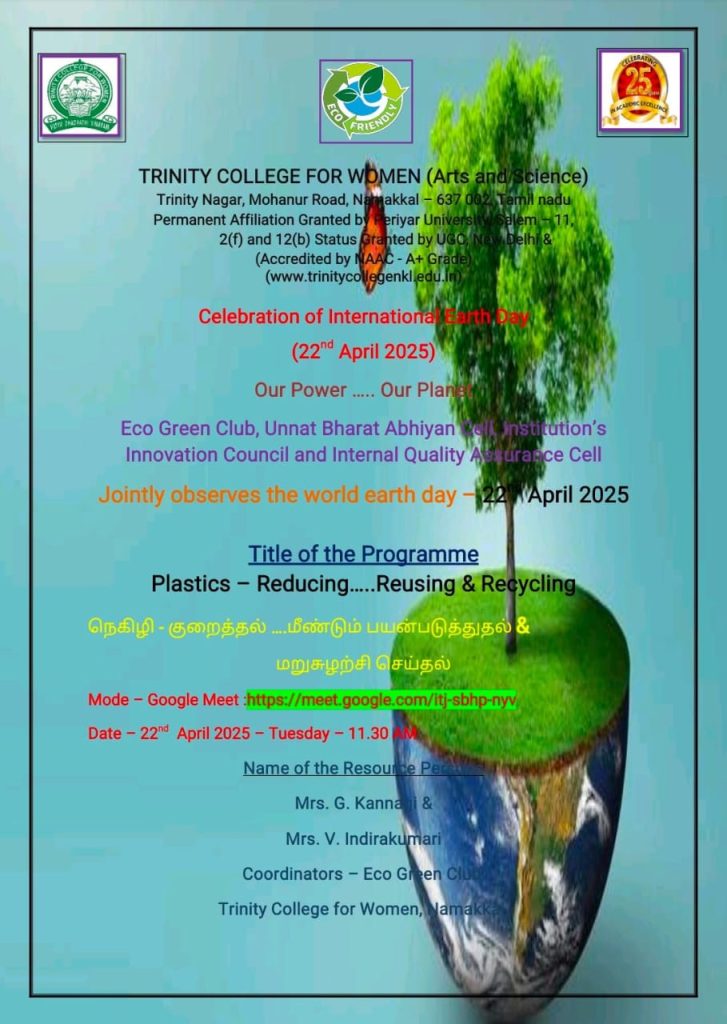 Owing to the International Day of Earth, The Eco Green Club, Unnat Bharat Abhiyan Cell, the Institution’s Innovation Council and Internal Quality Assurance Cell, Trinity College for Women, Namakkal conducted an awareness programme on 22.04.2025. It was held through the platform of Google Meet.