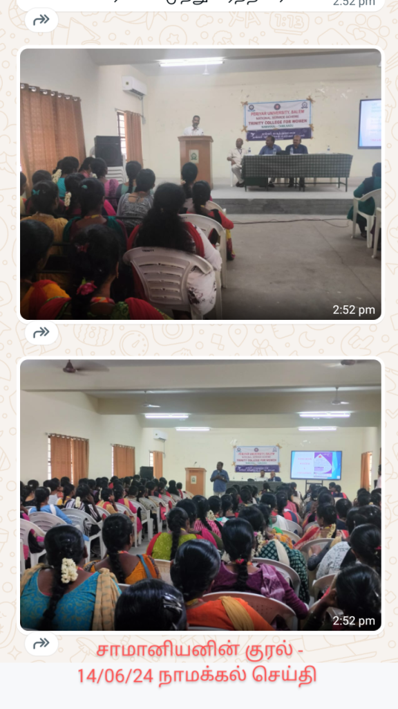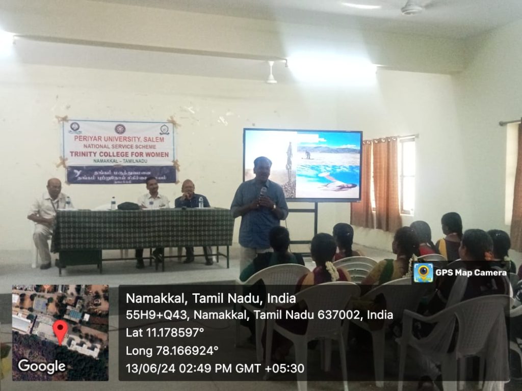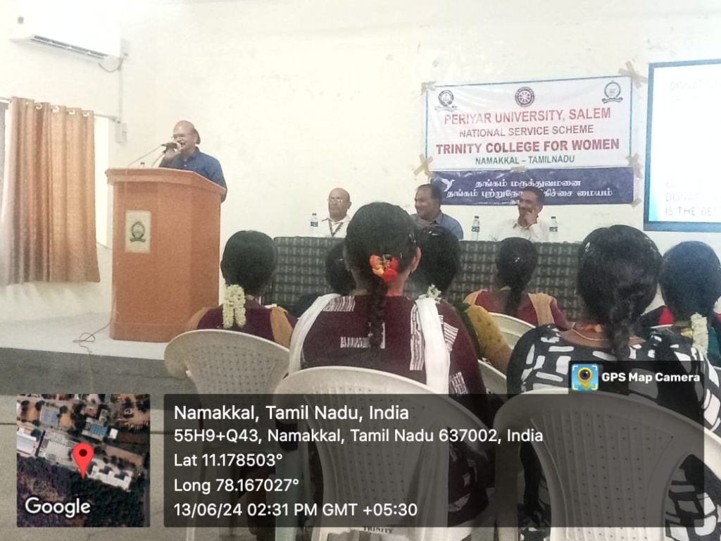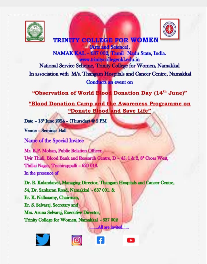 Owing to the international day of world blood donation, the National Service Scheme of Trinity College for Women, Namakkal, in association with M/s. Thangam Hospitals and Cancer Centre, Namakkal, conducted an event titled “Blood Donation Camp and the Awareness Programme on “Donate Blood and Save Life” on June 13, 2024. Mr. K.P. Mohan, Public Relations Officer, Uyir Thuli, Blood Bank and Research Centre, Thillai Nagar, Trichirapplli, was the special invitee. The speaker addressed the significance of blood donation and how donated blood is helpful for victims in an emergency.