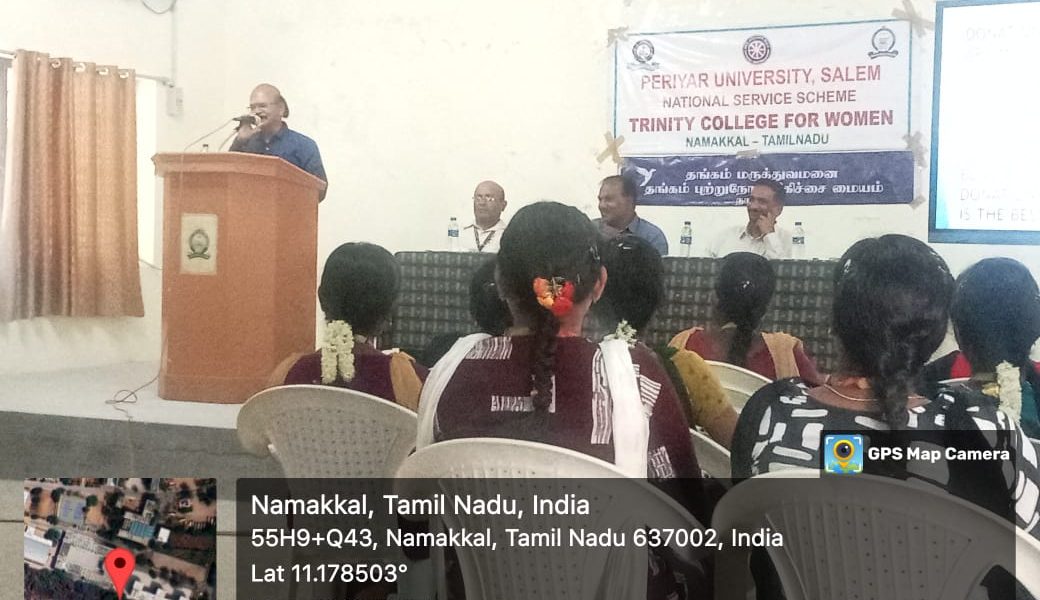Dr. K. Ramesh Kumar, Thangam Hospitals and Cancer Centre, Kanpur, Uttar Pradesh, Mr. K. Surendran, Blood Bank Staff and Mrs. T. Selvakumari, Public Relation Officer, Thangam Hospitals and Cancer Centre, Namakkal also took part. Dr. M.R. Lakshiminarayanan, Principal, welcomed the gathering. Dr. Arasuparameswaran, Coordinator, Silver Jubilee Celebrations, the NSS Programme Officers, Dr. M. Sasikala and Mrs. S. Jayamathi, Trinity College for Women, Namakkal also spoke on that occasion. Some of the volunteers of NSS donated blood to the blood bank of Thangam Hospitals and Cancer Centre, Namakkal on that day.