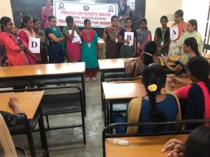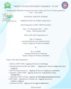 Owing to World AIDS Day, the NSS cell of Trinity College for Women, Namakkal organized a one day quiz event in the heading of “HIV/AIDS Awareness” on 01.12.2022. It was held in the venue of a mini seminar hall. Mrs. S. Usharani, Assistant Professor in Computer Science and Dr. S. Anidha, Assistant Professor in Chemistry, Trinity College for Women, Namakkal were the quiz masters.
