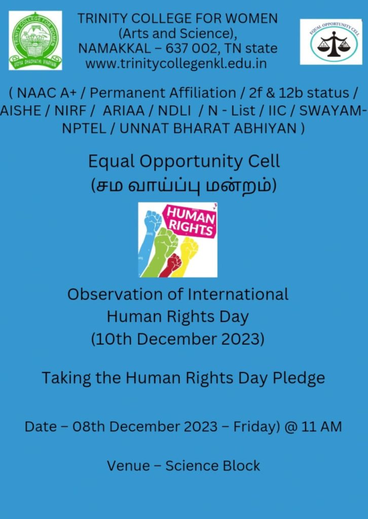 Owing to world human rights day (10.12.2023), the Equal Opportunity Cell, Trinity College for Women, Namakkal, observed International Human Rights Day on Friday (08th December 2023)