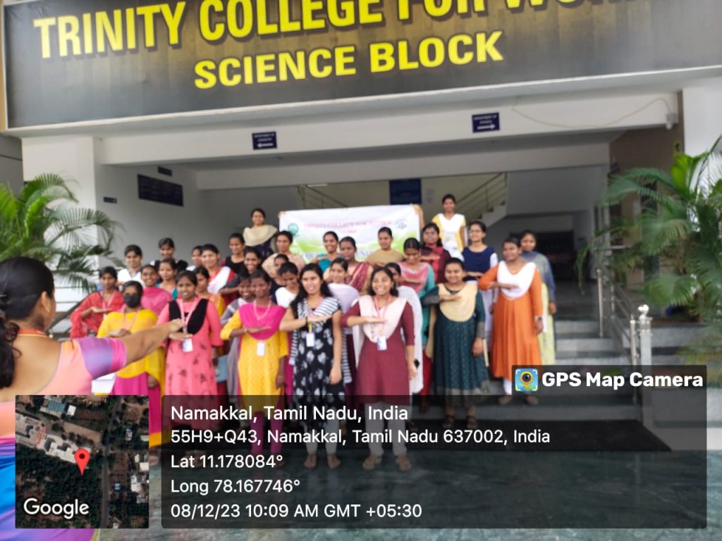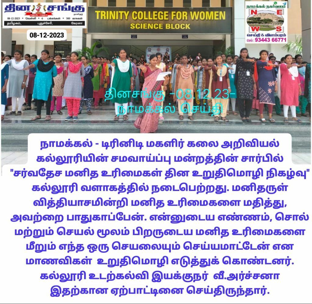 Owing to world human rights day (10.12.2023), the Equal Opportunity Cell, Trinity College for Women, Namakkal, observed International Human Rights Day on Friday (08th December 2023).    Mrs. V. Archana, Director of Physical Education,  Trinity College for Women, Namakkal, spoke about the significance of human rights and she highlighted the importance of dignity, justice and freedom.   All the students and the faculty were taking human rights pledge on that occasion.