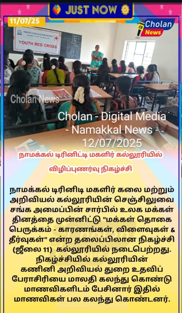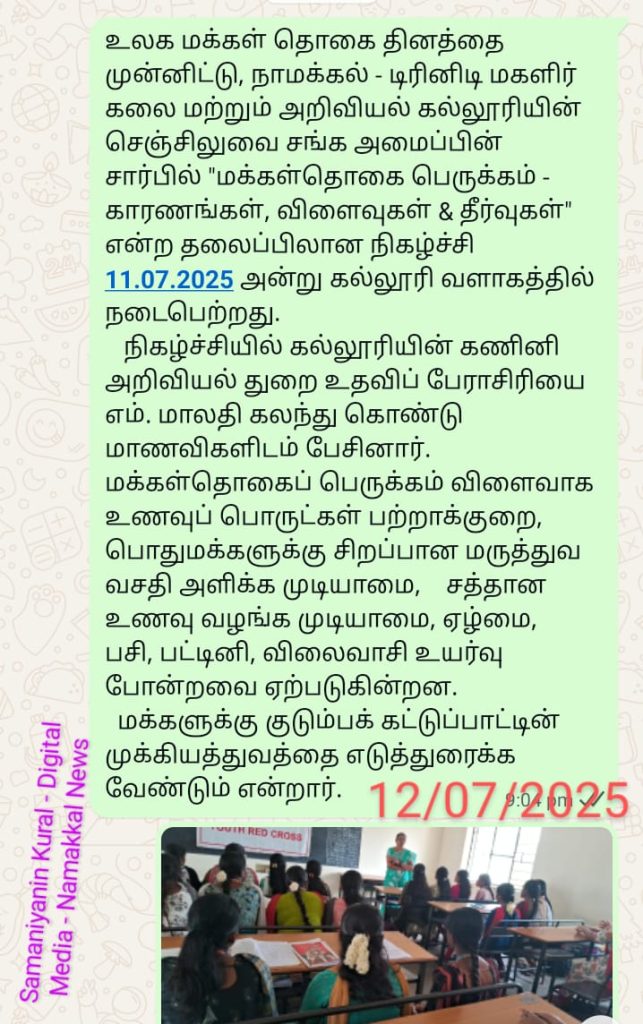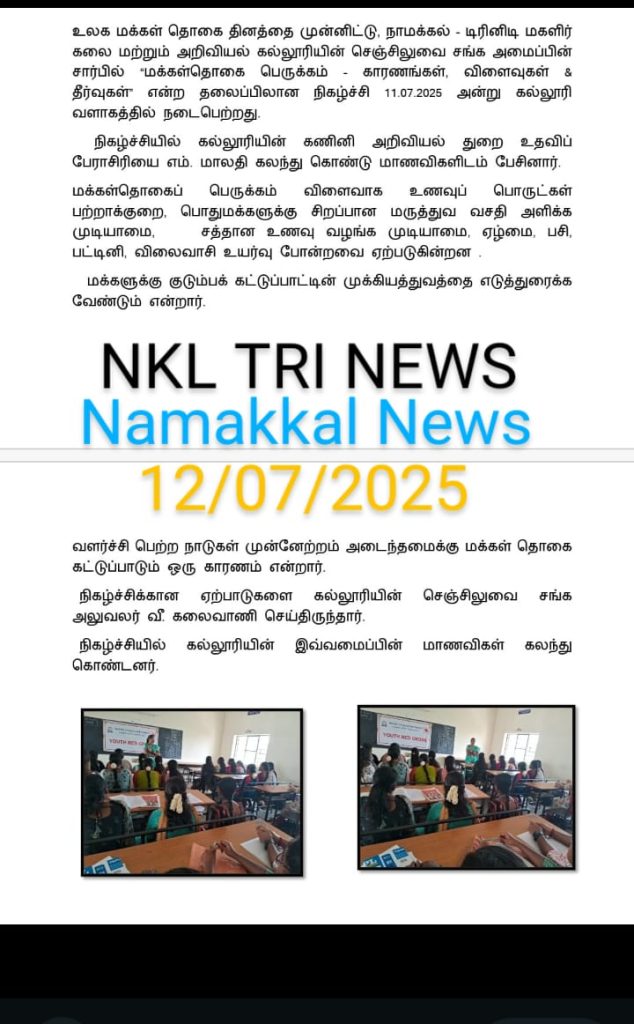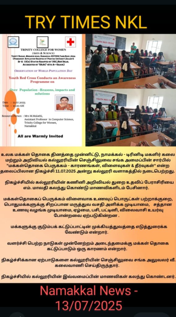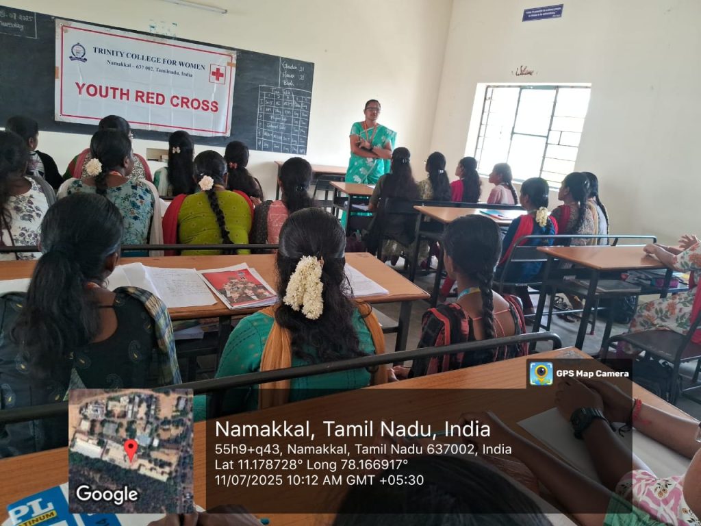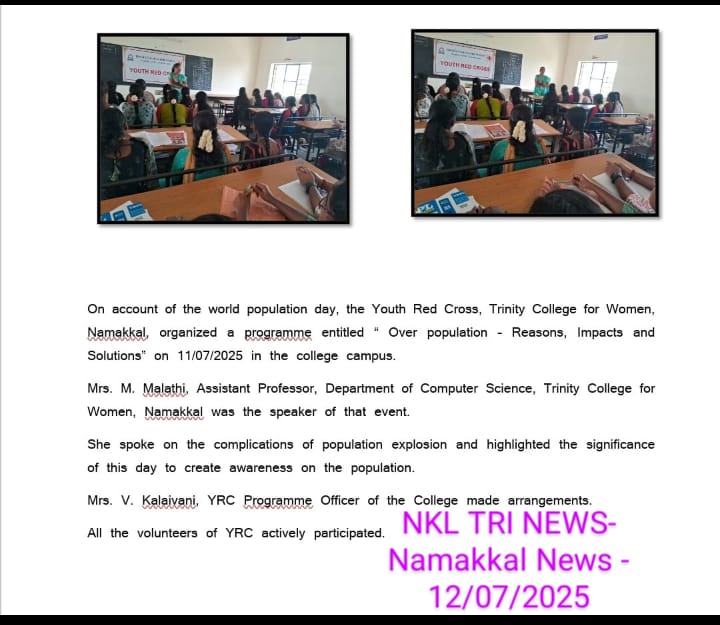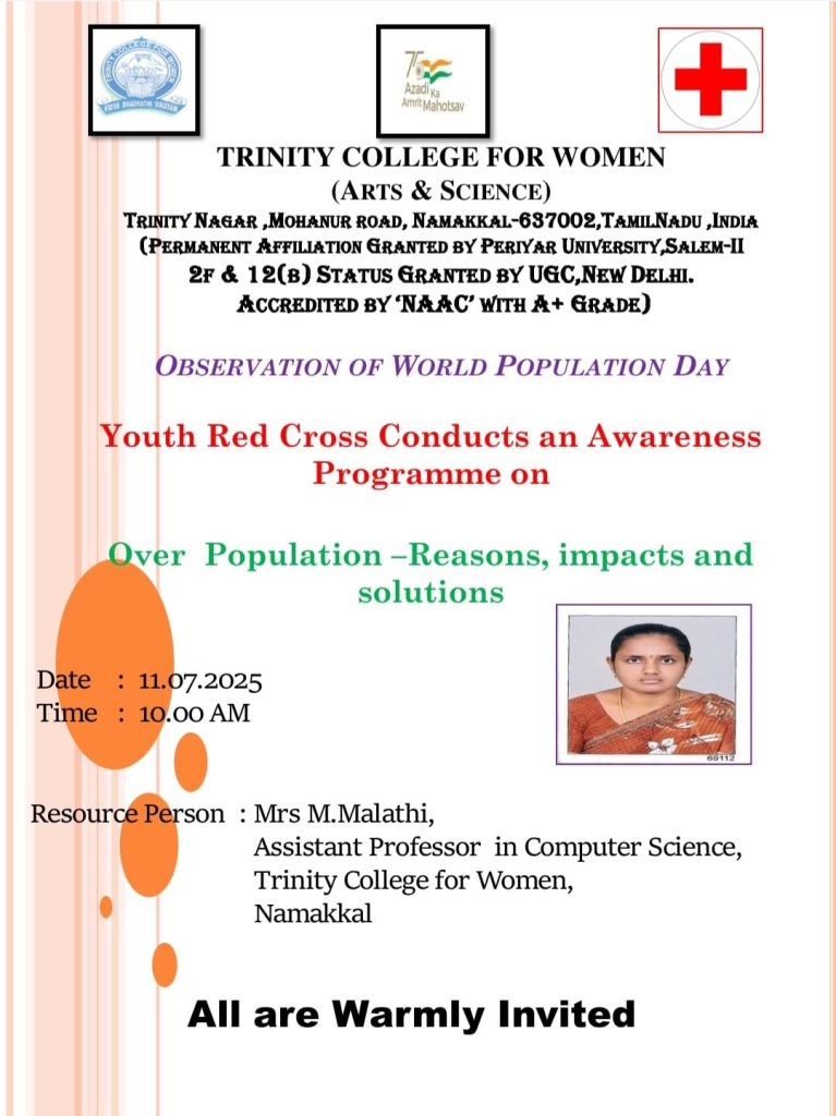 Owing to World Population Day, The Youth Red Cross of Trinity College for Women, Namakkal organized an awareness programme titled “Over Population – Reasons, Impacts and Solutions” on 11th July 2025 on the college campus.