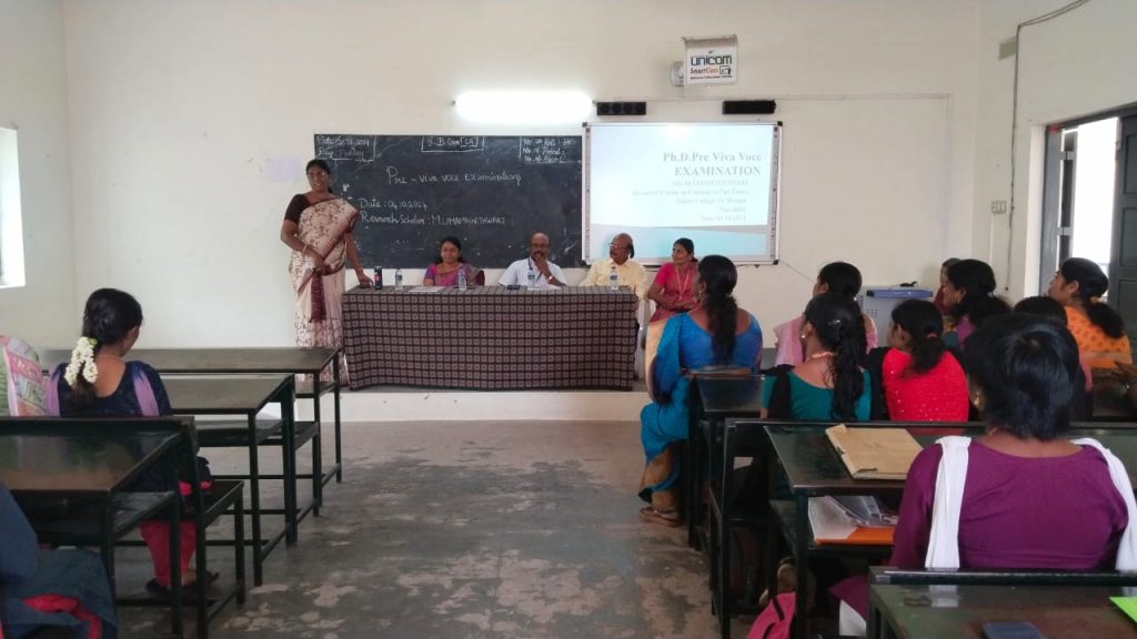 Mrs. M. Umamageswari presented their research findings through the powerpoint presentations. Dr. M.R. Lakshiminarayanan, Principal, Dr. Arasuparameswaran, Coordinator, Silver Jubilee Celebrations, Dr. S. Subadra, Associate Professor in Commerce, Thiruvalluvar Government Arts College, Andagalore, Rasipuram, Namakkal, (A member of doctoral committee of that Ph.D., Research Scholar), Dr. M. Bose, Assistant Professor in Commerce, Muthayammal College of Arts and Science (Autonomous), Rasipuram, Namakkal District, Dr R Navamani, Vice-Principal, Dr. M. Sasikala, Assistant Professor and Head, Department of Commerce & Senate Member, Periyar University, Salem, the faculty members of Commerce Mrs. G. Nithya, Dr. S. Devi, Dr. G. Sathiya Sangari, Mrs. M. Uma Mageswari, Mrs. M. Rajapadmavathi, Mrs. A. Rajeswari, Ms. P. Madhupriya and Ms. P. Dhanushiya, the students of Commerce took part in that Ph.D., Pre-Viva Examinations.