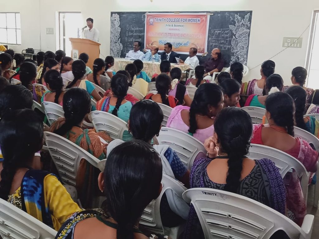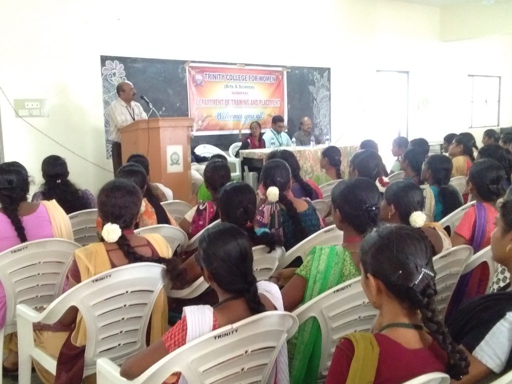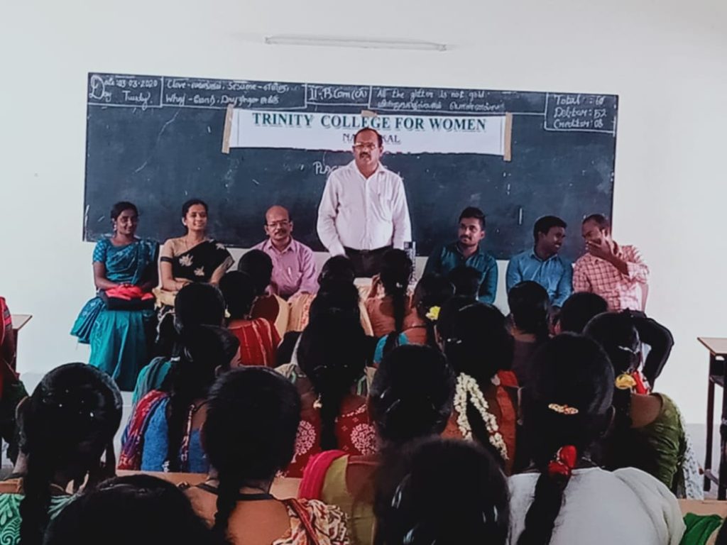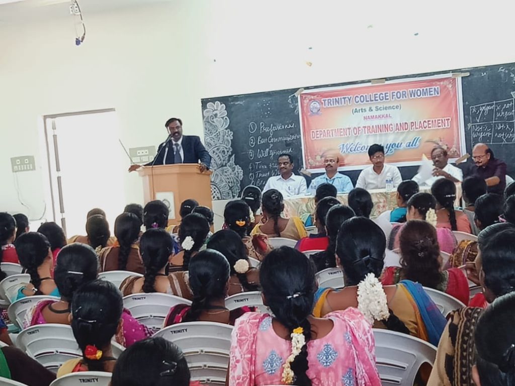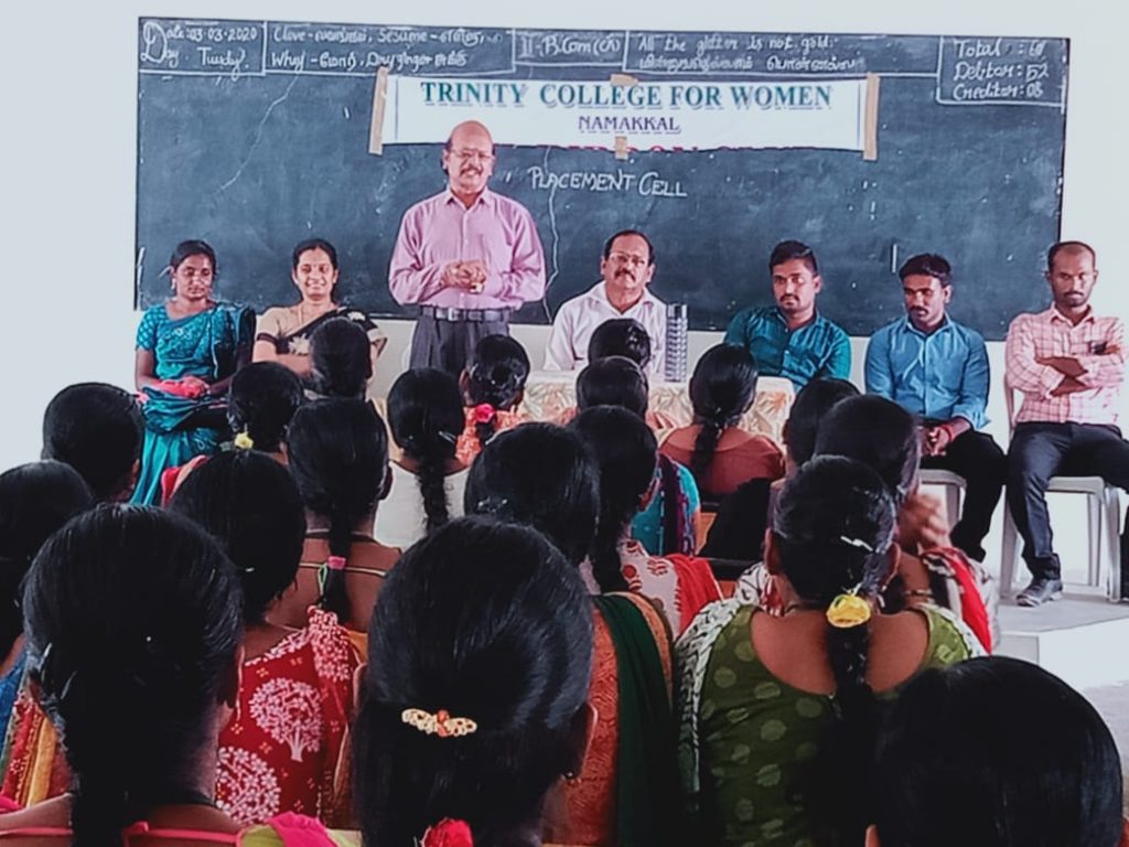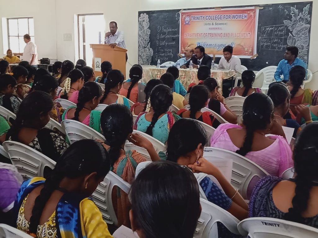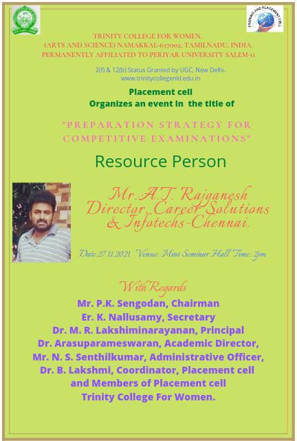 The Placement Cell of Trinity College for Women, Namakkal conducted a special talk on  “Preparation strategy for competitive examinations” on 27th November 2021 for the benefit of final year Undergraduate and Postgraduate students of our College.  Mr. A.T. Rajganesh, Director, Career Solutions & Infotechs, Chennai was the invited speaker.    The resource person briefly touched upon the TNPSC Examinations and updated them on the various current topics.   Further, he addressed the students as to how to prepare and study for such examinations, method of study, memory techniques, use of various websites, strategic planning, etc.,    Dr B. Lakshmi, Placement Officer welcomed the gathering.  Dr. Arasuparameswaran, Director – Academic proposed the vote of thanks.  More than 250 students took part in that occasion.  3 Attachments