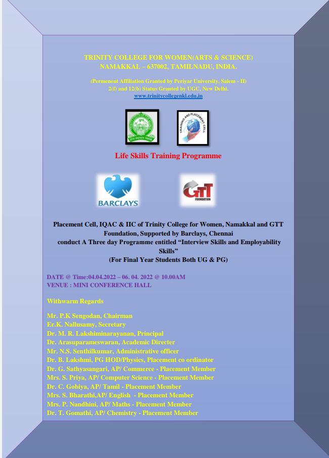 The Placement Cell, Internal Quality Assurance Cell & Institution’s Innovation Cell of Trinity College for Women, Namakkal and GTT Global Talent Track) Foundation, Pune, in support of Barclays, Chennai conducted a 3 day programme in the title of “Like Skills Training Programme – Interview Skills & Employability Skills” from 04th April 2022 to 6th April 2022 (Monday to Wednesday) for the benefit of final year Undergraduate and Postgraduate students.