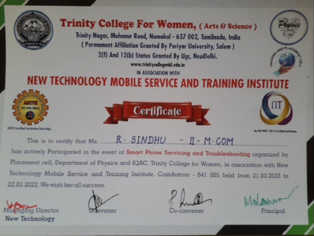 Android phones are very essential for our day-to-day activities.   The majority of people have android phones.    Particularly, during the period of COVID -19 lock down, many online classes have been executed for the benefit of students of Schools, Colleges, Universities and other higher educational institutions through the touch screen mobile.   In this regard, the Department of Physics, Placement Cell and Internal Quality Assurance Cell of Trinity College for Women, Namakkal in support of M/s. New Technology Mobile Service and Training Institute, Singanallur, Coimbatore (AICTE Certified Institution – Internship) jointly organized a two day workshop entitled “Smart Phone Servicing and Troubleshooting” on 21.03.2022 & 22.03.2022.  It was held in the venue of the Physics laboratory.  203 students of various courses participated in that event.  Giving support to students including extracurricular programs along with University curriculum is very important, on this subject, it was organized for the sake of our students of Trinity College for Women, Namakkal.