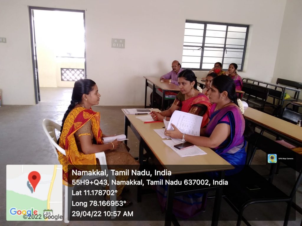 In this regard, Mrs. R. Radhiga, District Employment Officer,  Namakkal was the invited speaker.                                    Tamil Nadu Government recruits all types of Qualifications like 10th standard, 12th, Any Degree jobs for all eligible candidates through written and oral examinations.   As per our norms of Tamil Government, 69% of reservation system is followed in all the Government Jobs, she enumerated.  Hard working, technical knowledge, subject knowledge, communication skills, personality development and other soft skills are needed for all the industries both the Government and Private sectors, she stressed.  Apart from Tamil Nadu Government jobs, she explained the job opportunities in the Government sectors of Railway, Banks, Defense, Police, Army, Navy, Staff Selection Commission and Civil Service Examinations.   Beside that she highlighted the significance of entrepreneurship for our nation’s development.