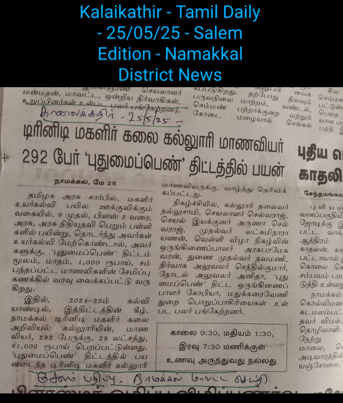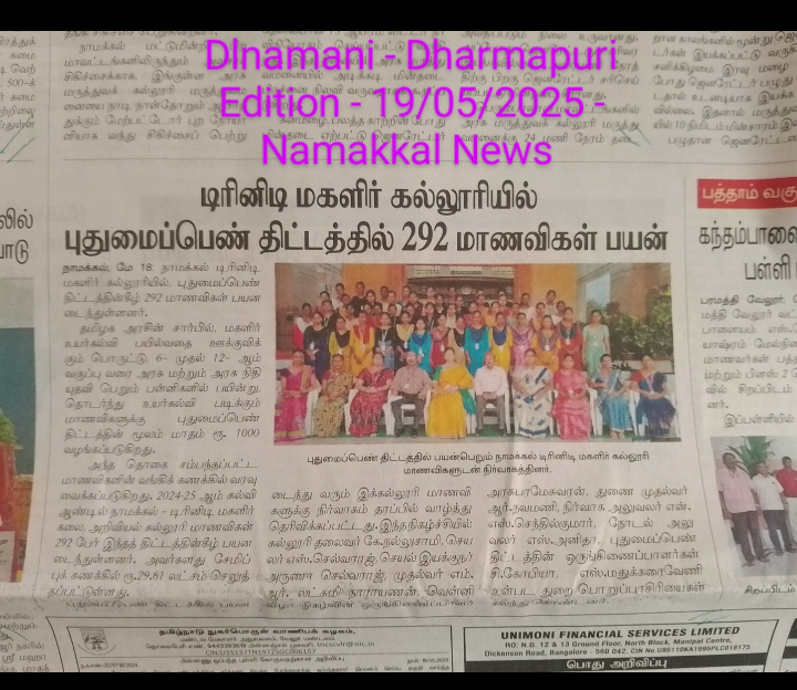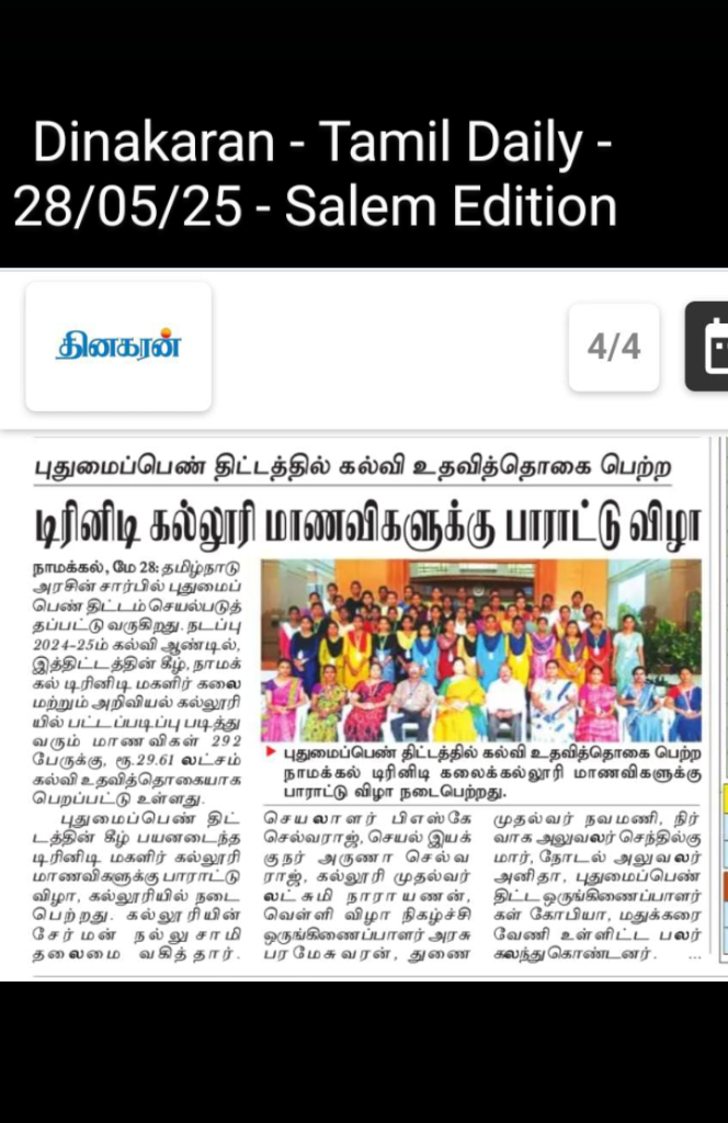 During the academic year 2024-2025, 292 students of Trinity College for Women, Namakkal benefited, and they have obtained a scholarship amount from the Government of Tamil Nadu – Rs. 29,61,000/-.