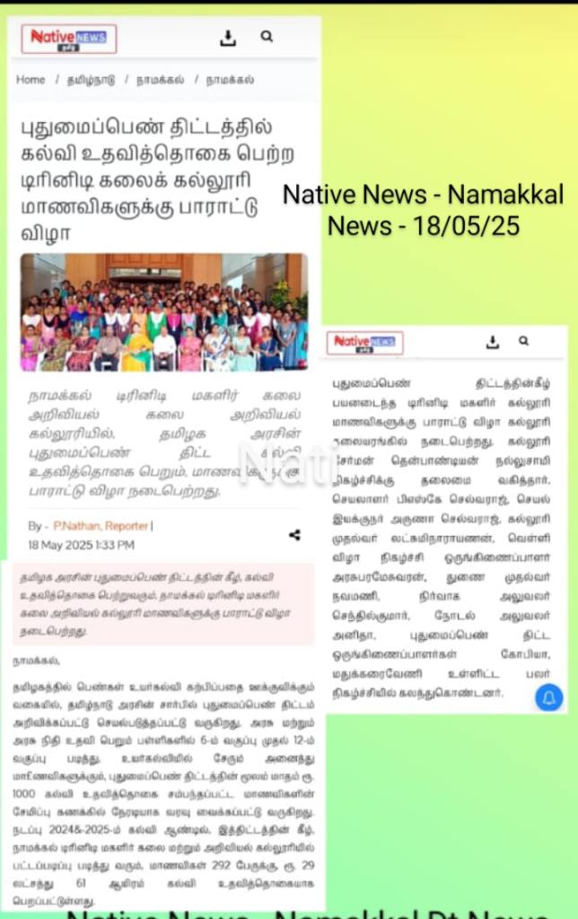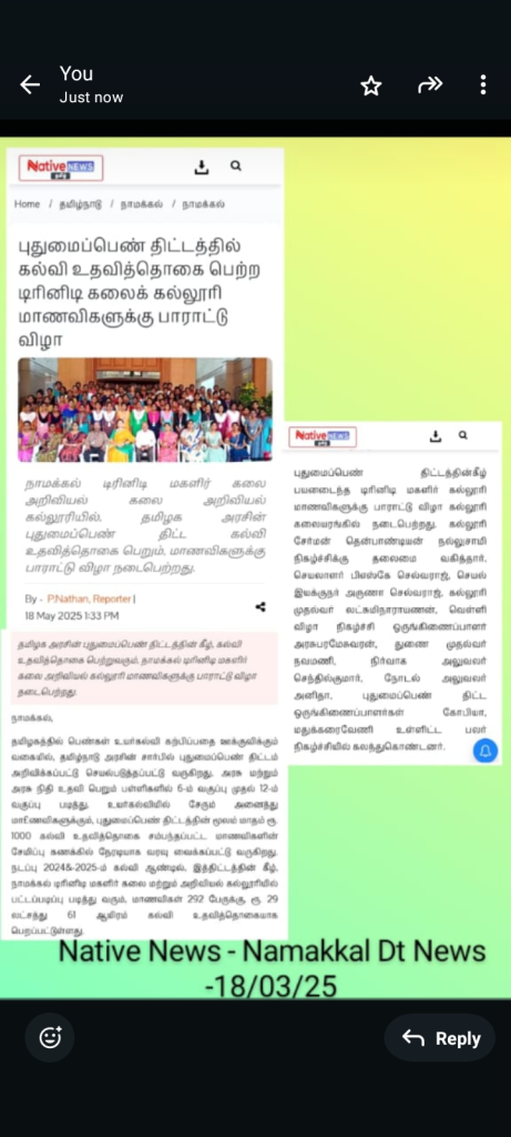 In continuation, a felicitation function was held on 16th May 2025 in the premises of Trinity College for Women, Namakkal.