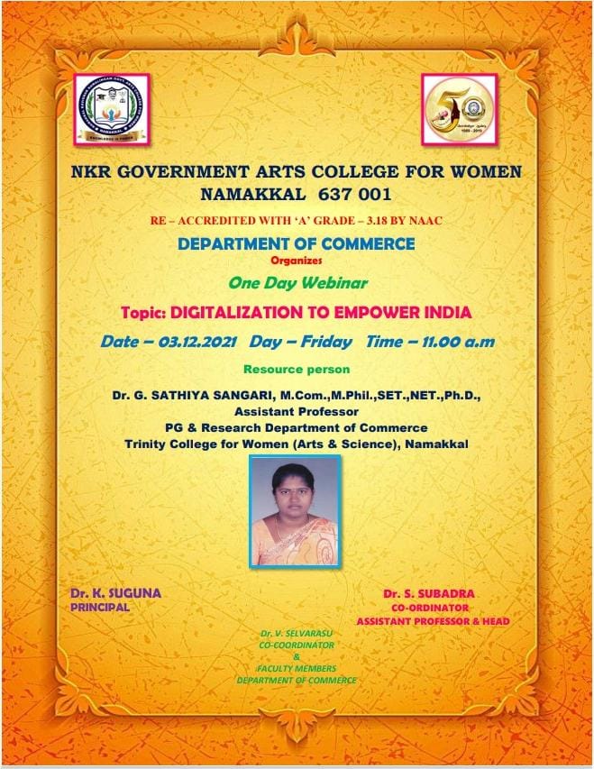 Dr. G. Sathiya Sangari, Assistant Professor in Commerce of our College delivered the lecture programme for the benefit of students of Commerce in Namakkal Kavignar Ramalingam Government Arts and Science College for Women, Namakkal on 03rd December 2021. She delivered the topic of “Digitalization to empower India”. This event was organized by the department of Commerce, NKR Government Arts and Science College, Namakkal. Dr G. Sathiya Sangari is congratulated.