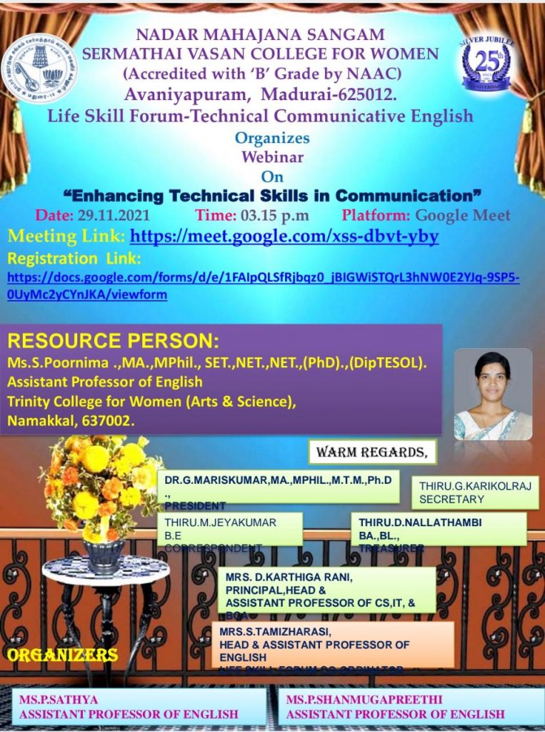 Ms. S. Poornima, Assistant Professor of our College has delivered a lecture programme in the title of Enhancing Technical Skills in Communication Skills on 29.11.2021. It was held through the platform of Google Meet. This programme was organized by Life Skill Forum Technical Communicative English of Nadar Mahajana Sangam Sermathai Vasan College for Women, Avaniapuram, Madurai.