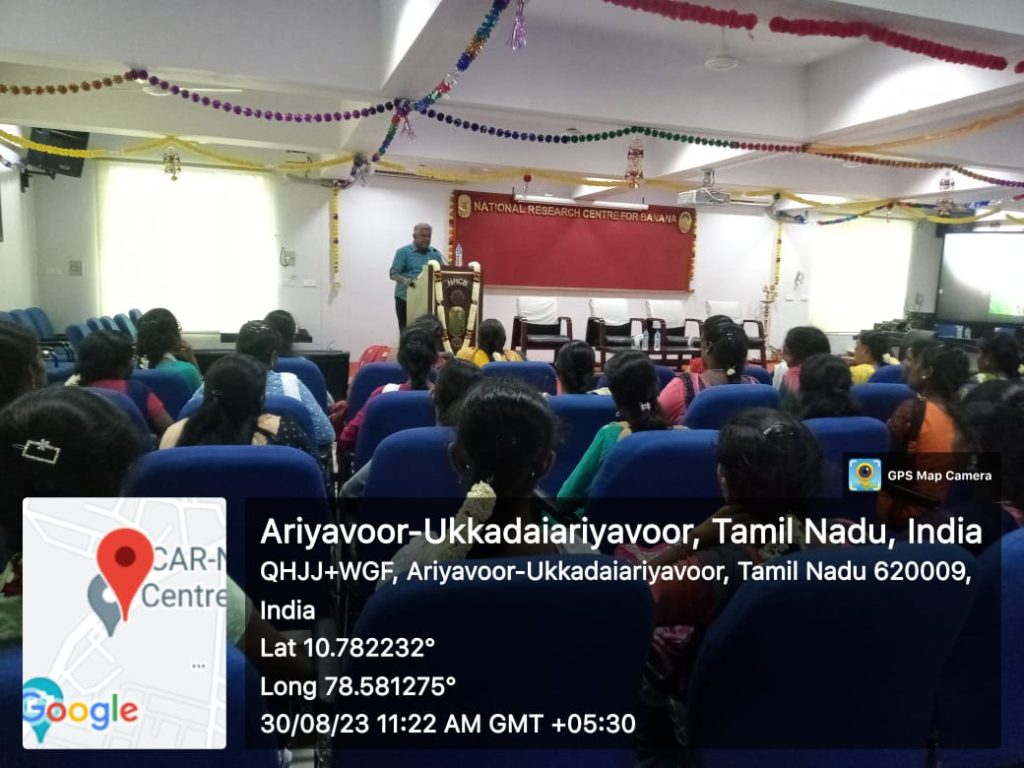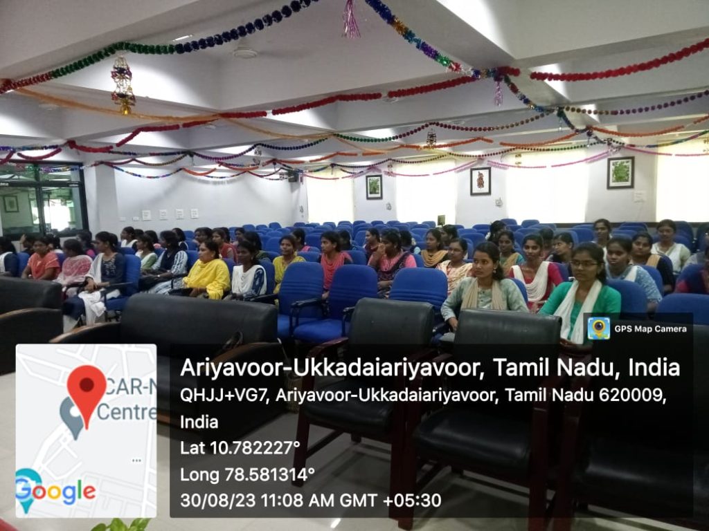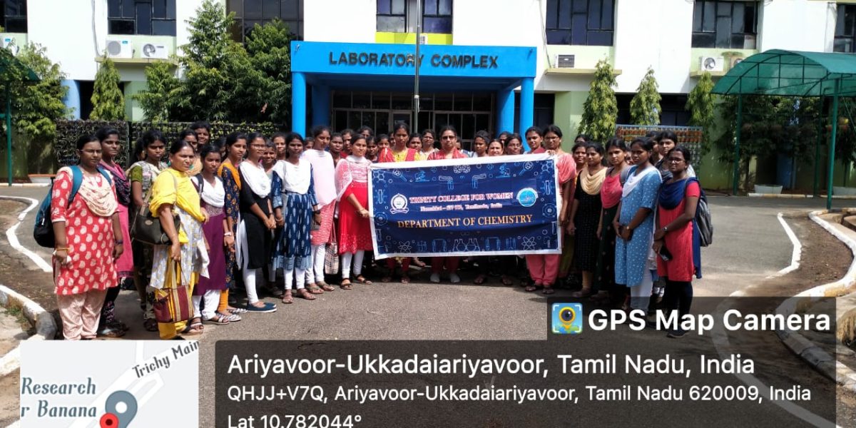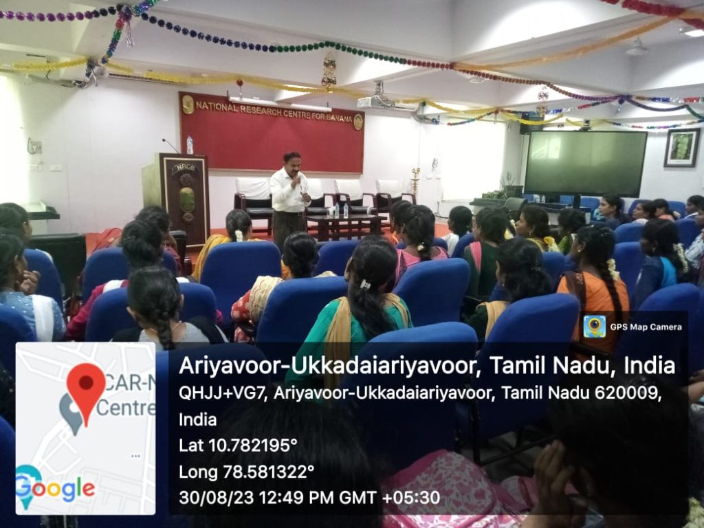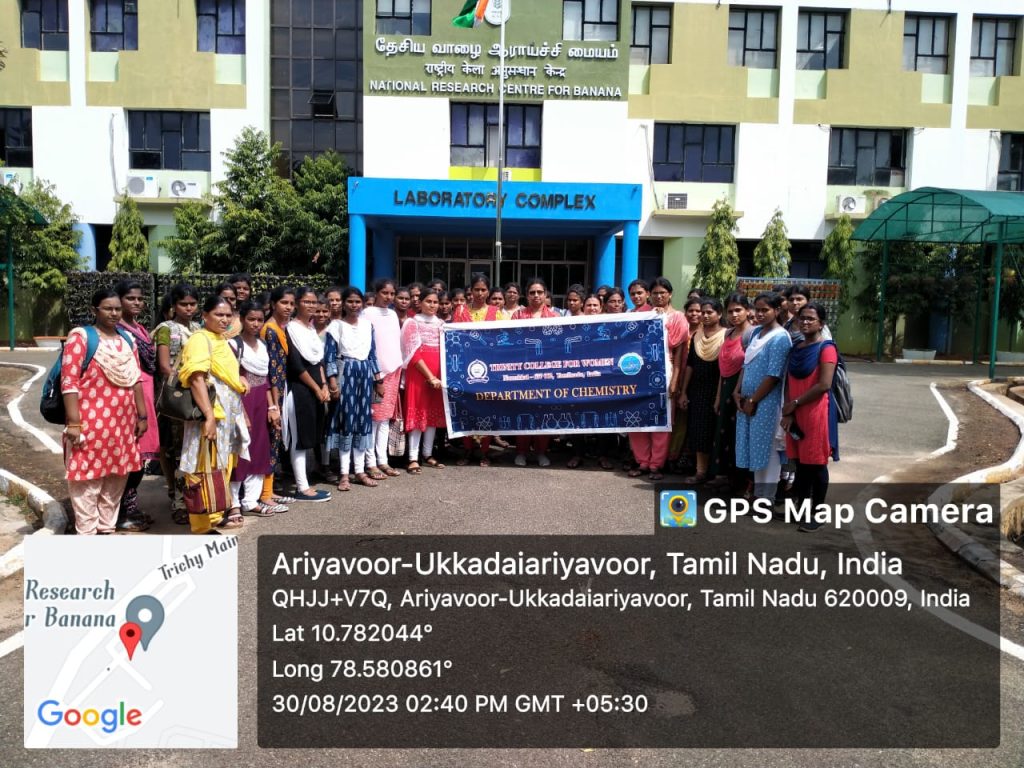 Six faculty members and 52 students of Chemistry at Trinity College for Women, Namakkal, visited the research institute of the Indian Council of Agricultural Research (National Research Centre for Banana, Thogamalai Road, Thayanur, Trichirappalli) on August 30, 2023. Dr. C. Karpagam, Principal Scientist (Agri. Extension), and Mr. P. Ravichamy, a staff member of this organization, have explained the major thrust areas of banana research like crop improvement, crop production, post-harvest management, and crop protection. They have also seen the various laboratories like tissue culture, soil science, nutrient management, biotechnology, physiology, biochemistry, entomology, nematology, fungal, bacterial, and viral pathology, and post-harvest technology research.