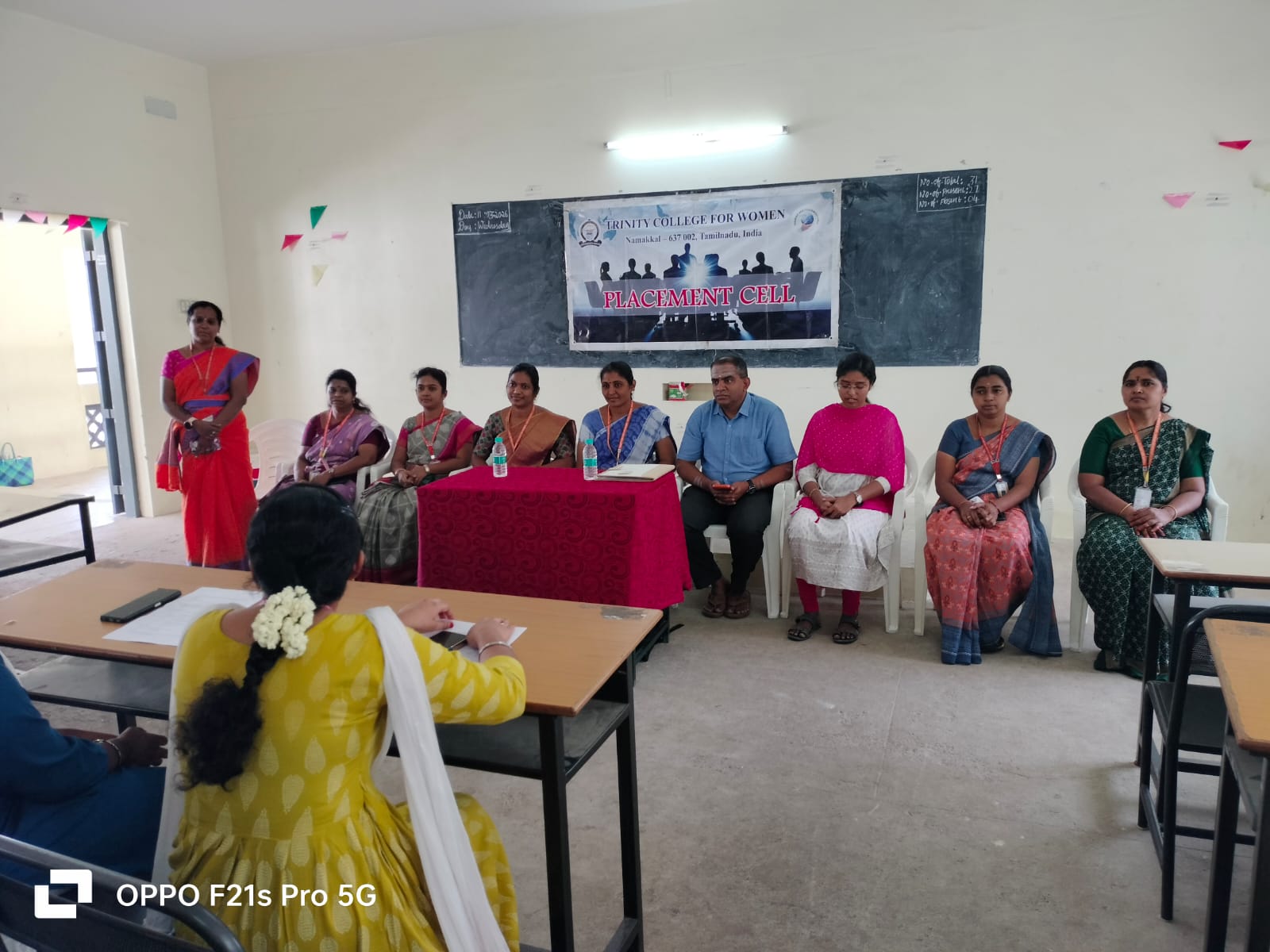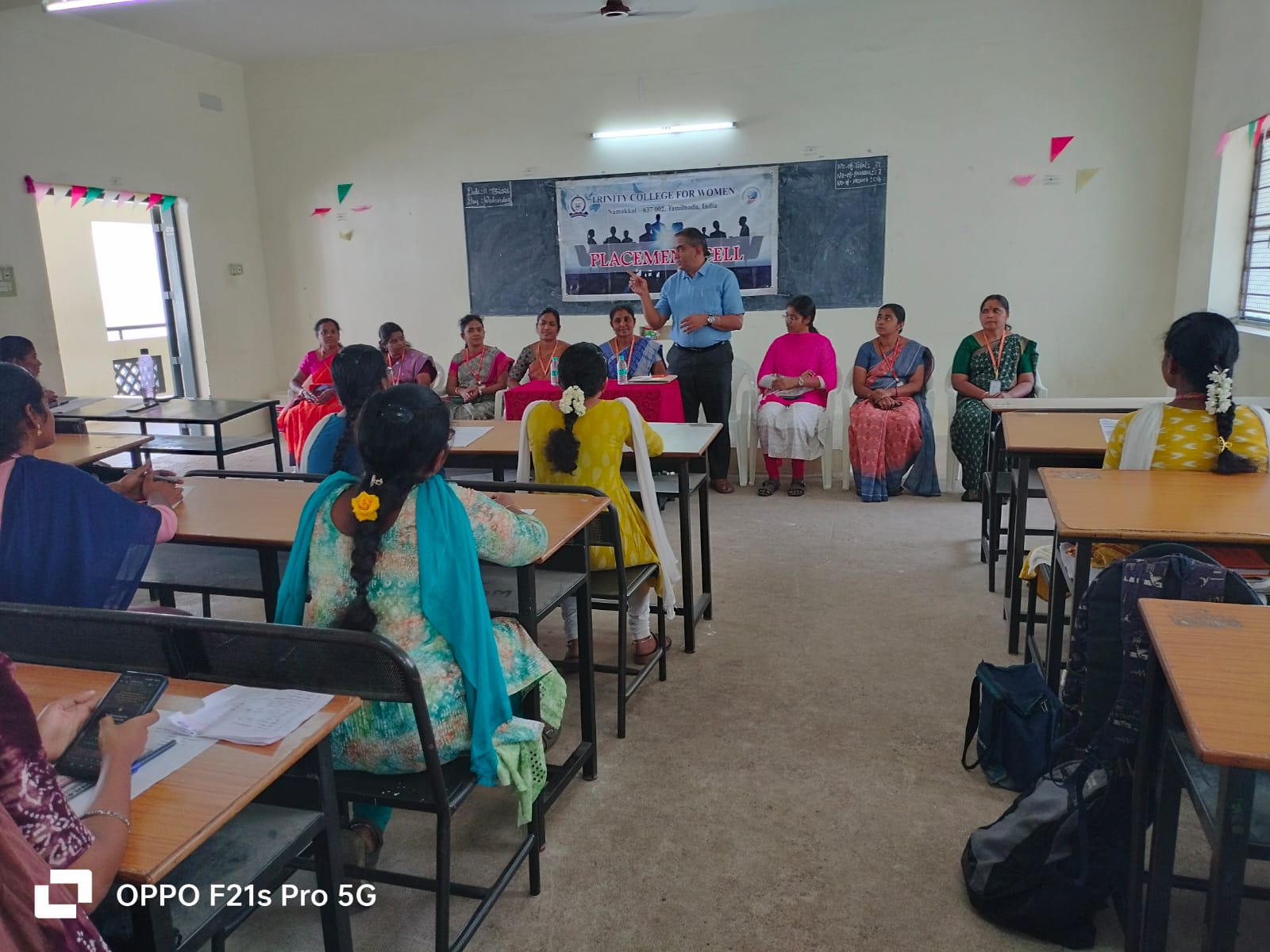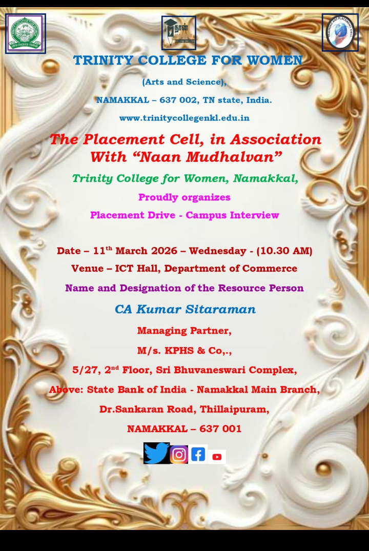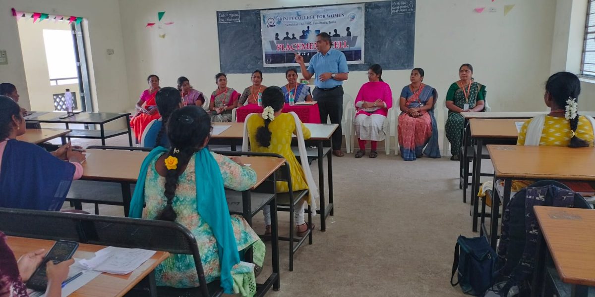 The Placement Cell, in association with the Naan Mudhalvan, Trinity College for Women, Namakkal, conducted a programme entitled “Interpersonal Skills Enhancement cum Campus Interview – Placement Drive” on 11th March 2026 in the College premises. CA. Kumar Sitaraman, Managing Partner, M/s. KPHS & Co., 5/27, 2nd Floor, Sri Bhuvaneswari Complex, Dr. Sankaran Road, Namakkal was the resource person. The Chartered Accountant highlighted the significance of soft skills for successful placement in renowned organizations. Apart from that, the selecting organization conducted a written test, group discussion and HR Personal Interview. Nearly 50 final year students of B.Com., B.Com., CA and M.Com., of the College took part. Dr. M. Sasikala, HOD of Commerce, Dr. B. Lakshmi, Placement Officer along with the faculty of Commerce and Placement Cell Members made arrangements.
