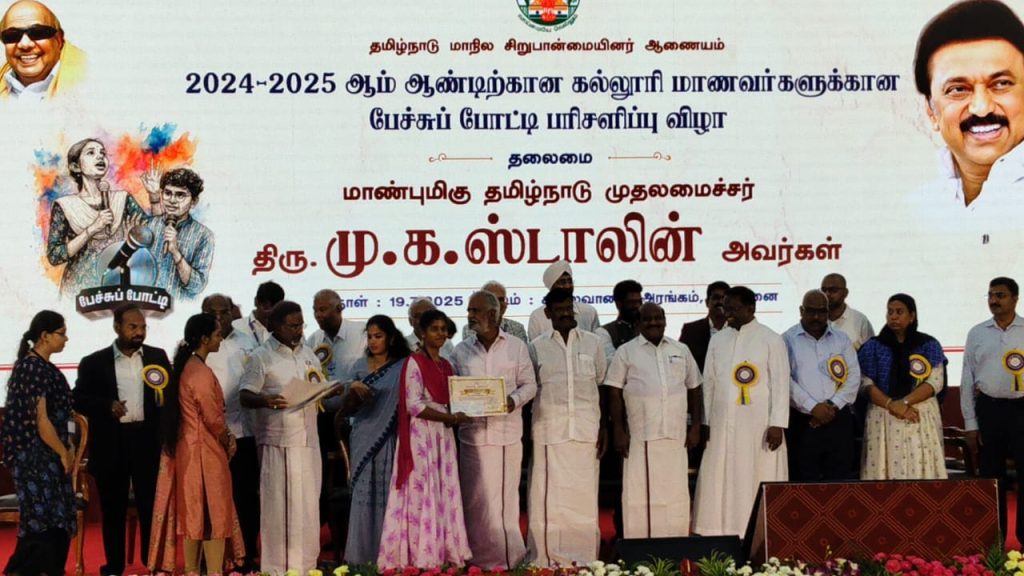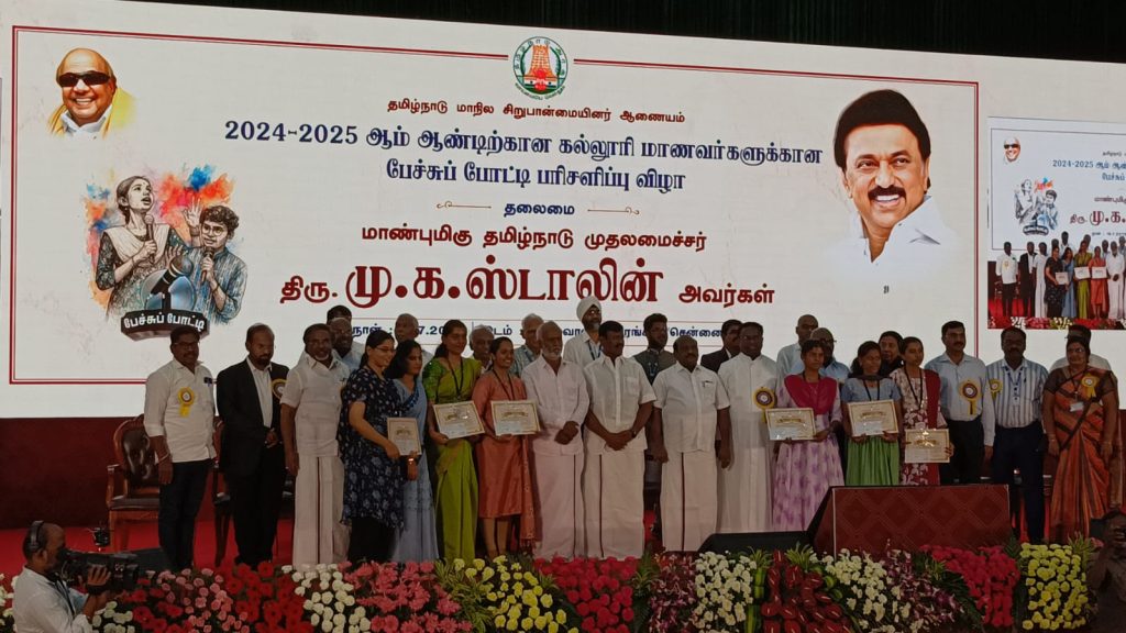 In this continuation, an award ceremony was held on 19.07.2025 at the venue of Kalaivanar Arangam, Chepauk, Chennai. A prize-winning celebration for 234 students who won a district and state-level speech competition, organized by the Tamil Nadu State Minority Commission on that day.