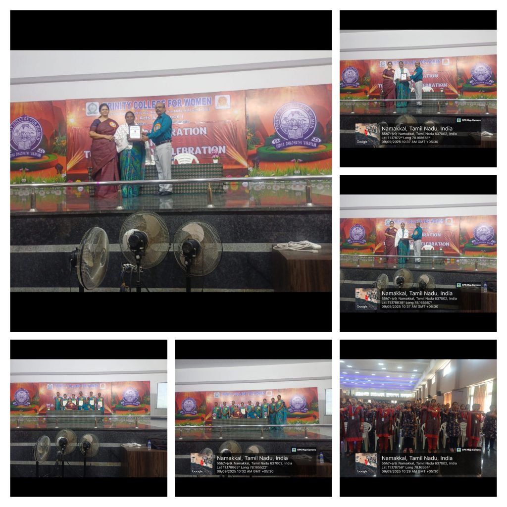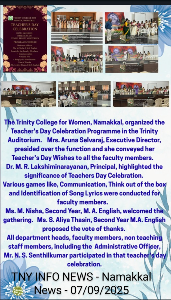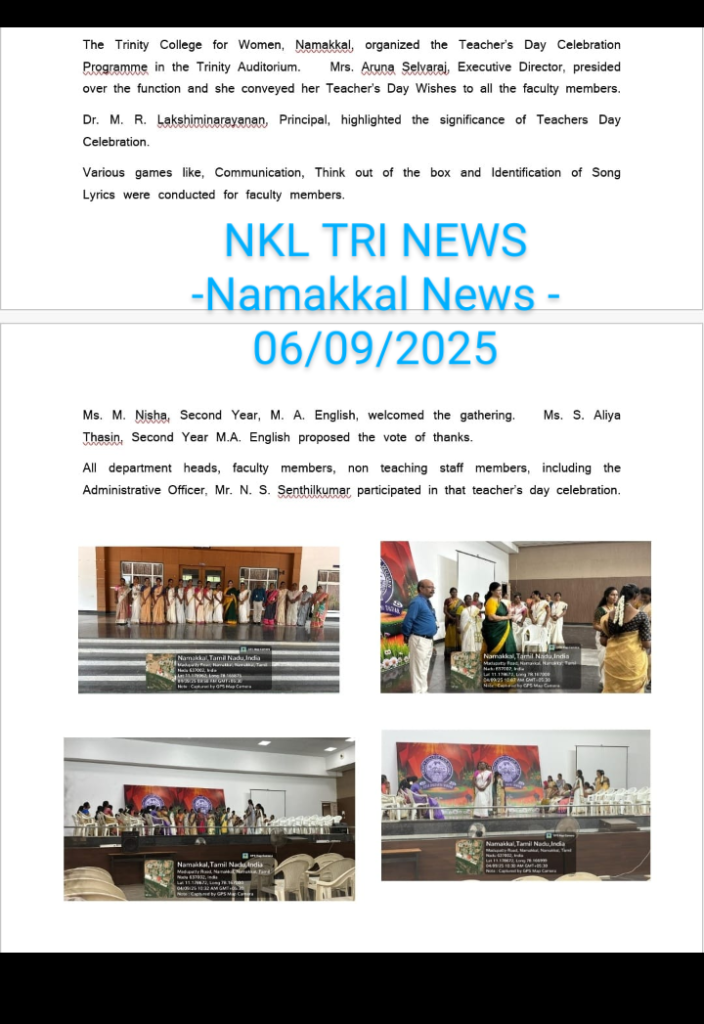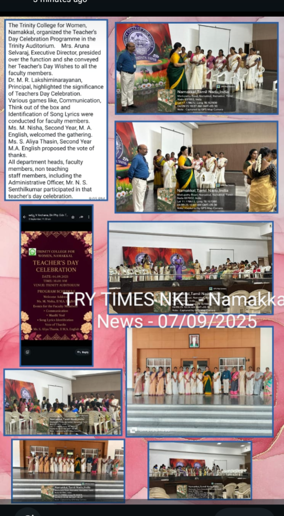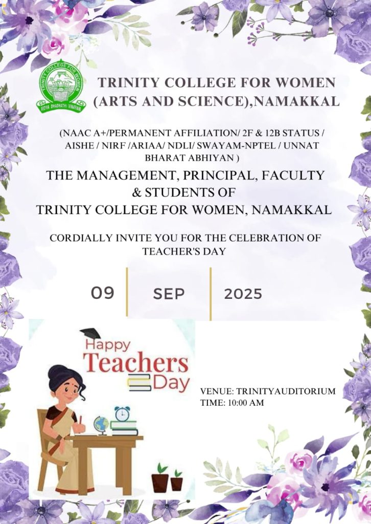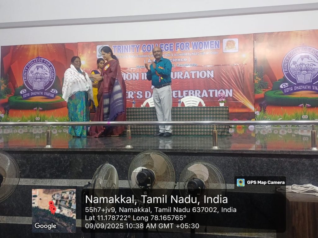 The Teacher’s Day Celebration at the Trinity College for Women, on 04th September 2025, was a pleasant event marked by a spirit of appreciation and recognition.  Mrs. Aruna Selvaraj, Executive Director of the College, presided over the programme, and she conveyed her teacher’s day best wishes to the faculty members of the College.    Dr. M.R. Lakshiminarayanan, Principal, welcomed the gathering, and he highlighted the significance of celebrating Teachers’ Days on every 5th September.   The senior faculty members delivered speeches and shared their experiences in the teaching profession.