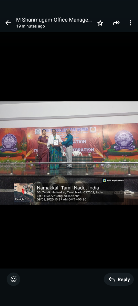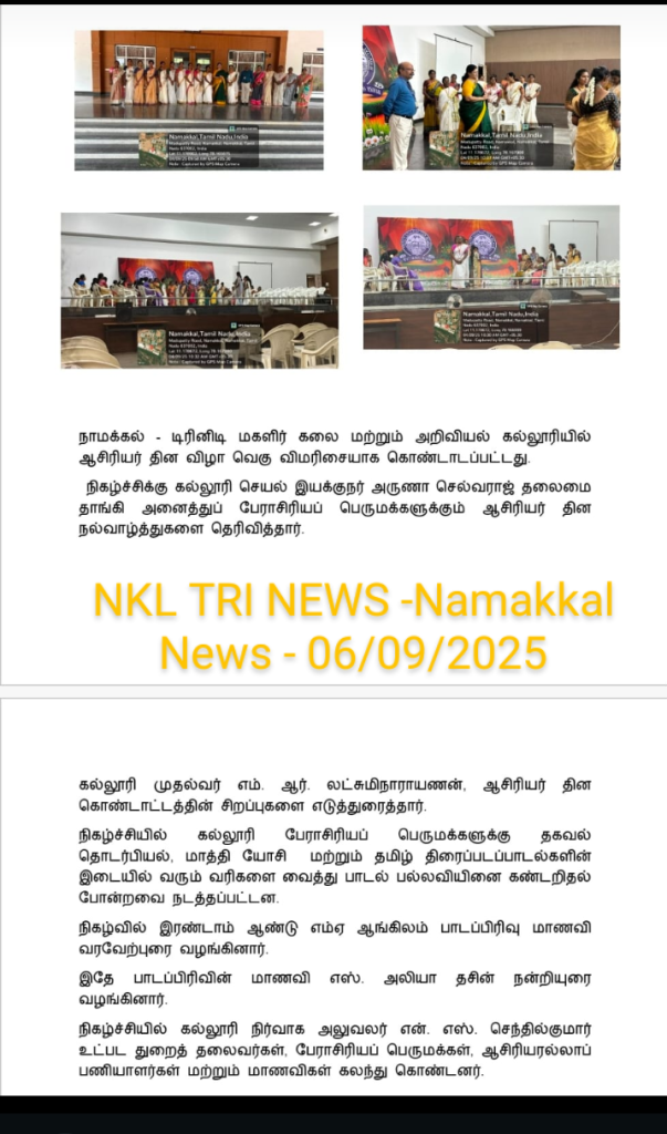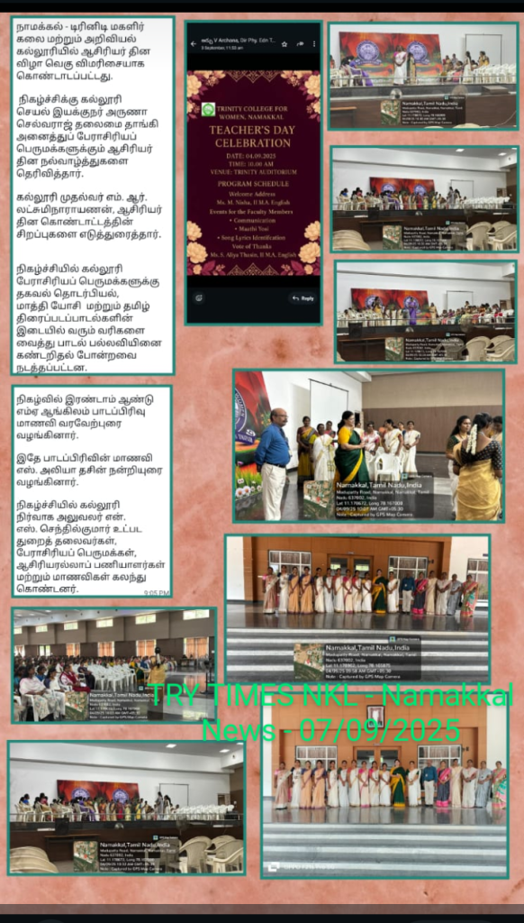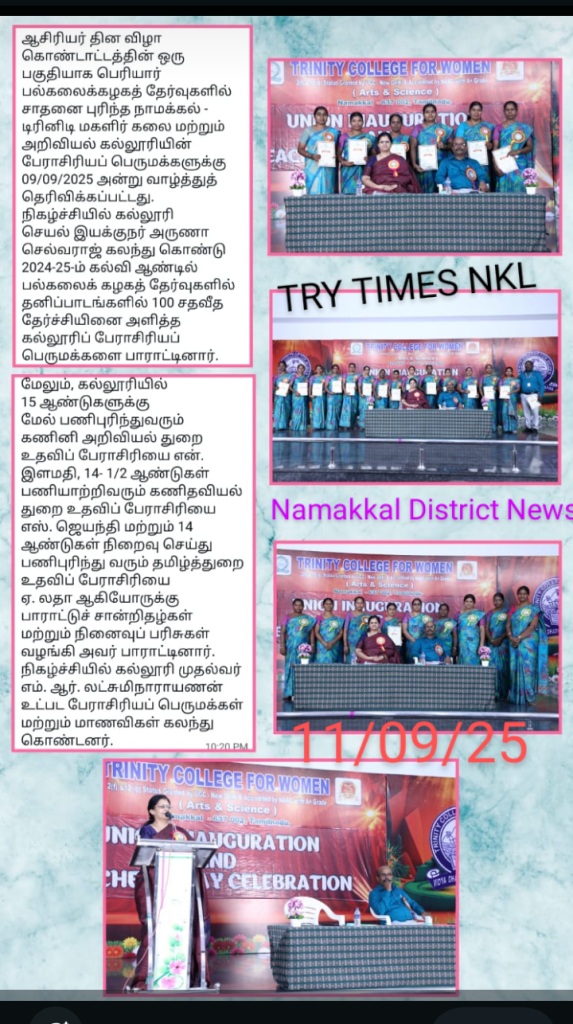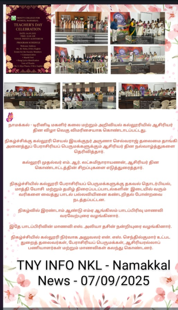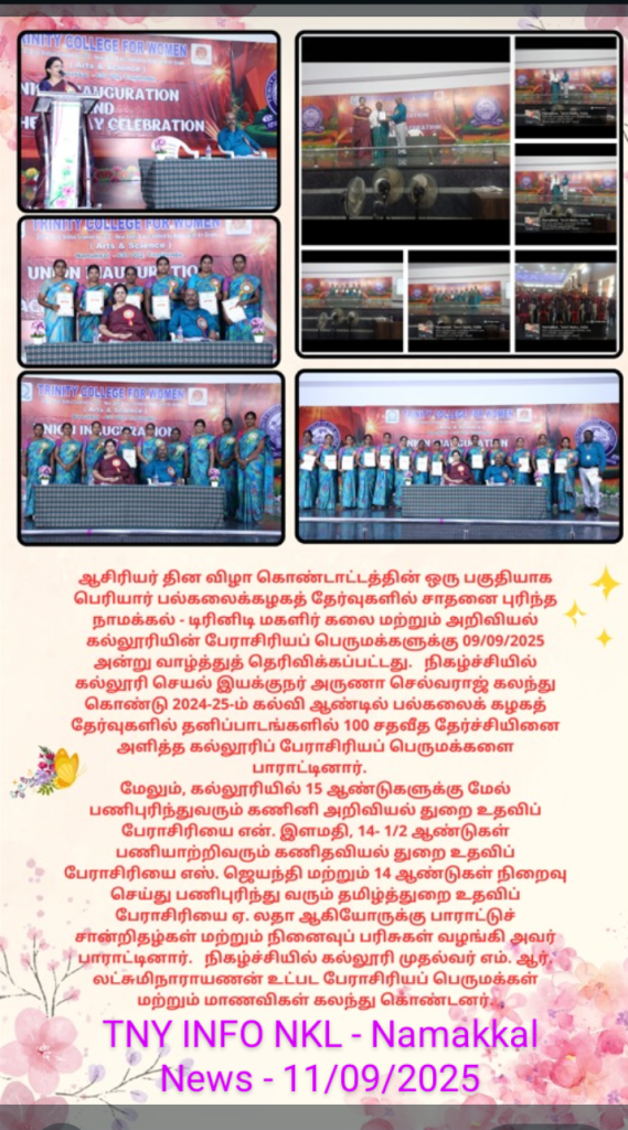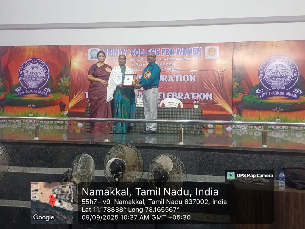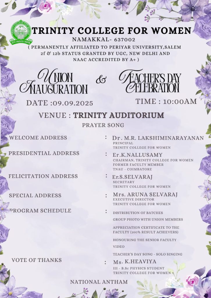 The Teacher’s Day Celebration at the Trinity College for Women, on 04th September 2025, was a pleasant event marked by a spirit of appreciation and recognition.  Mrs. Aruna Selvaraj, Executive Director of the College, presided over the programme, and she conveyed her teacher’s day best wishes to the faculty members of the College.    Dr. M.R. Lakshiminarayanan, Principal, welcomed the gathering, and he highlighted the significance of celebrating Teachers’ Days on every 5th September.   The senior faculty members delivered speeches and shared their experiences in the teaching profession.