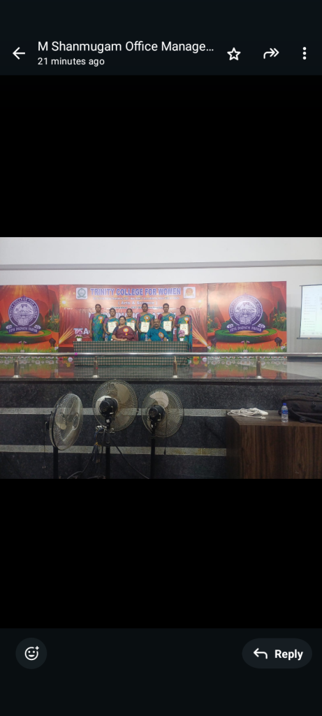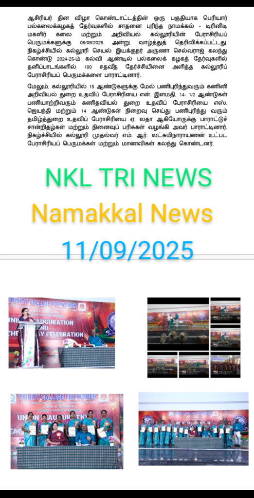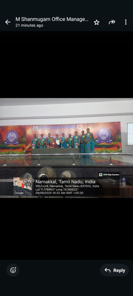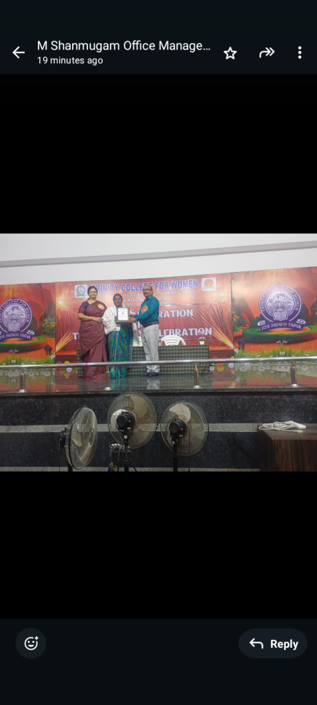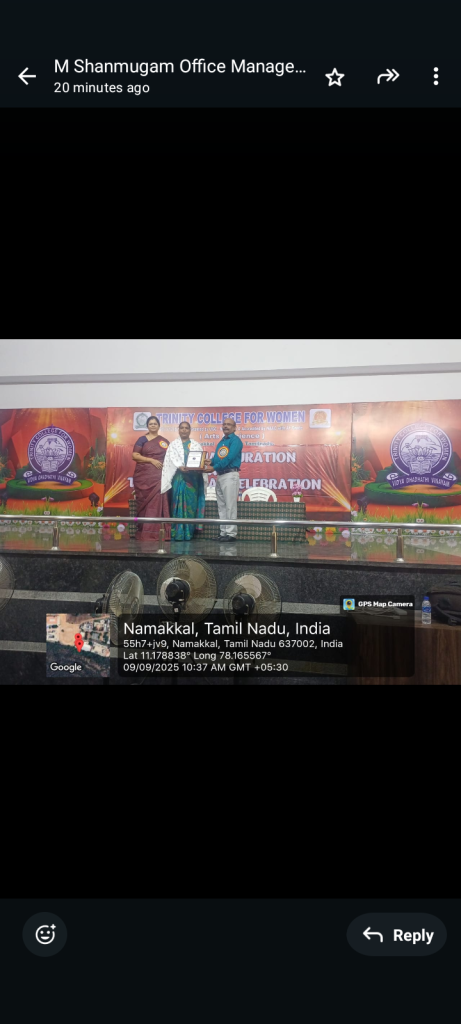 In continuation, the management of Trinity College for Women, Namakkal, organized a “Faculty Appreciation Programme” on 09.09.2025 in the Trinity Auditorium.    The Chairman, Er. K. Nallusamy, The Secretary, Er. S. Selvaraj, Mrs. Aruna Selvaraj, Executive Director and Dr. M.R. Lakshiminarayanan, Principal, conveyed their greetings to the faculty members who achieved centum (100%) results in the Periyar University Examinations during the academic year 2024-2025.