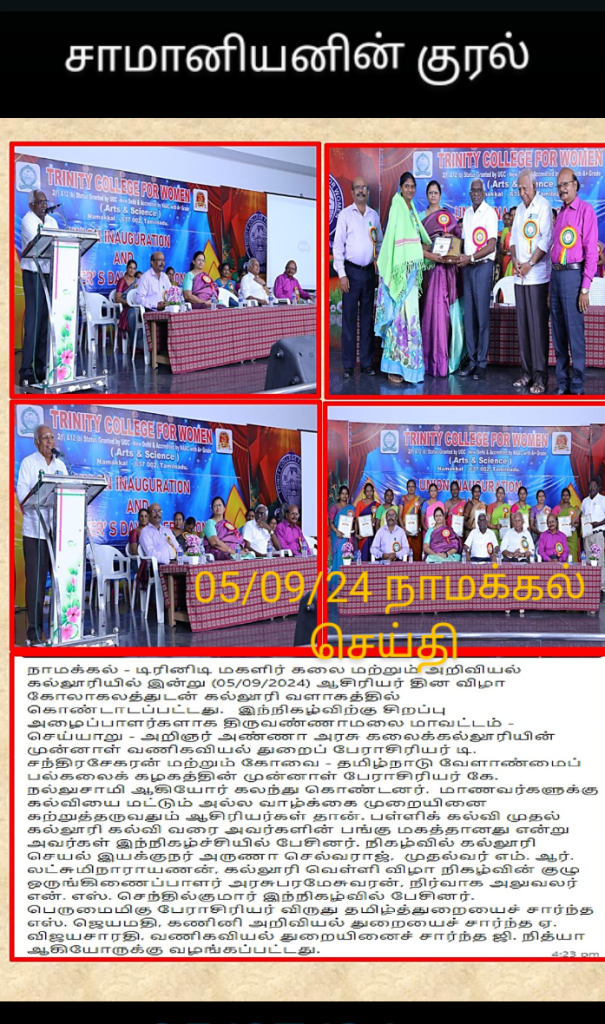Teacher’s day was celebrated in Trinity College for Women, Namakkal with great enthusiasm on Thursday (5th September 2024). The Special invitees were Mr. D. Chandrasekaran, former faculty, Department of Commerce, Arignar Anna Government Arts College, Cheyyar, Thiruvannamalai District and Mr. K. Nallusamy, Former Faculty of Tamil Nadu Agricultural University, Coimbatore.