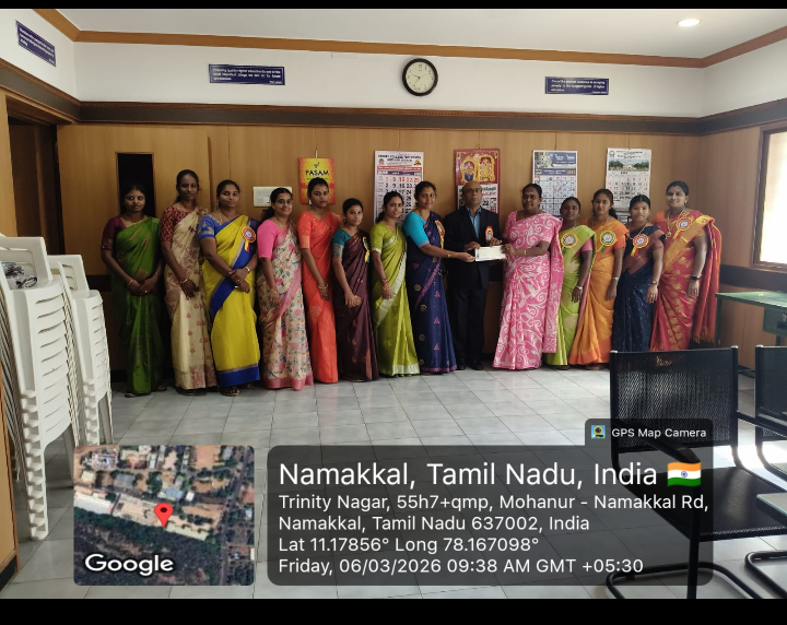 This event was held on March 6, 2026, on the premises of Trinity College for Women, Namakkal. Dr. R. Navamani, President of the Trinity College Alumni Association, presented a cheque for ₹10,000 to Dr. M.R. Lakshiminarayanan, Principal of the College, on that occasion.