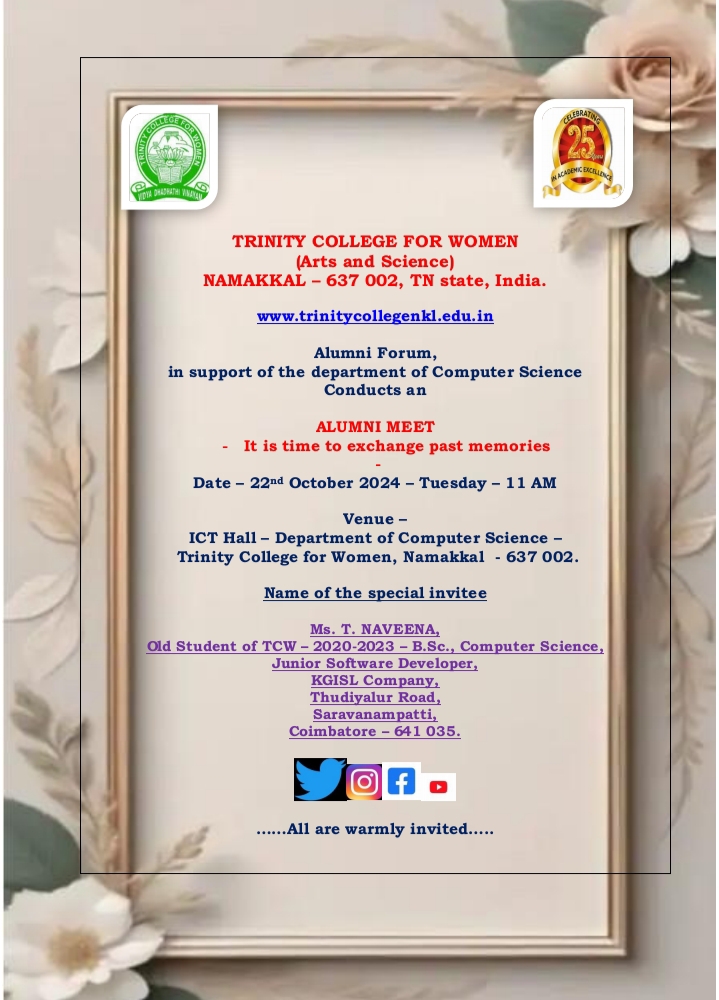 The Alumni Forum, in association with the department of Computer Science, Trinity College for Women, Namakkal, conducted an “ALUMNI MEET—It is time to get past memories” on 22nd October 2024. It was held in the place of ICT Hall, Department of Computer Science. Ms. T. NAVEENA, Old Student of TCW – 2020-2023 – B.Sc., Computer Science & Junior Software Developer, KGISL Company, Saravanampatti, Coimbatore, was the special invitee. College life is very important for all. While we are studying in college, we should focus only on our studies. Chances are boundless, she denoted. Also, she remembered her experience happened in the college while she was studying at Trinity College for Women.