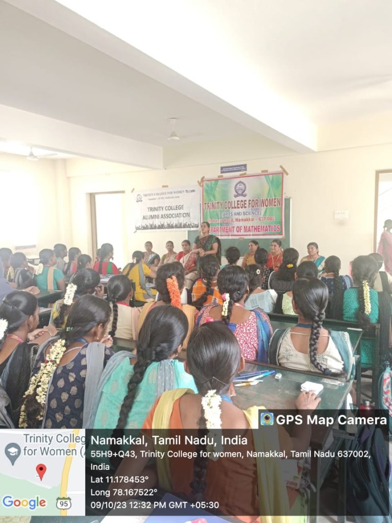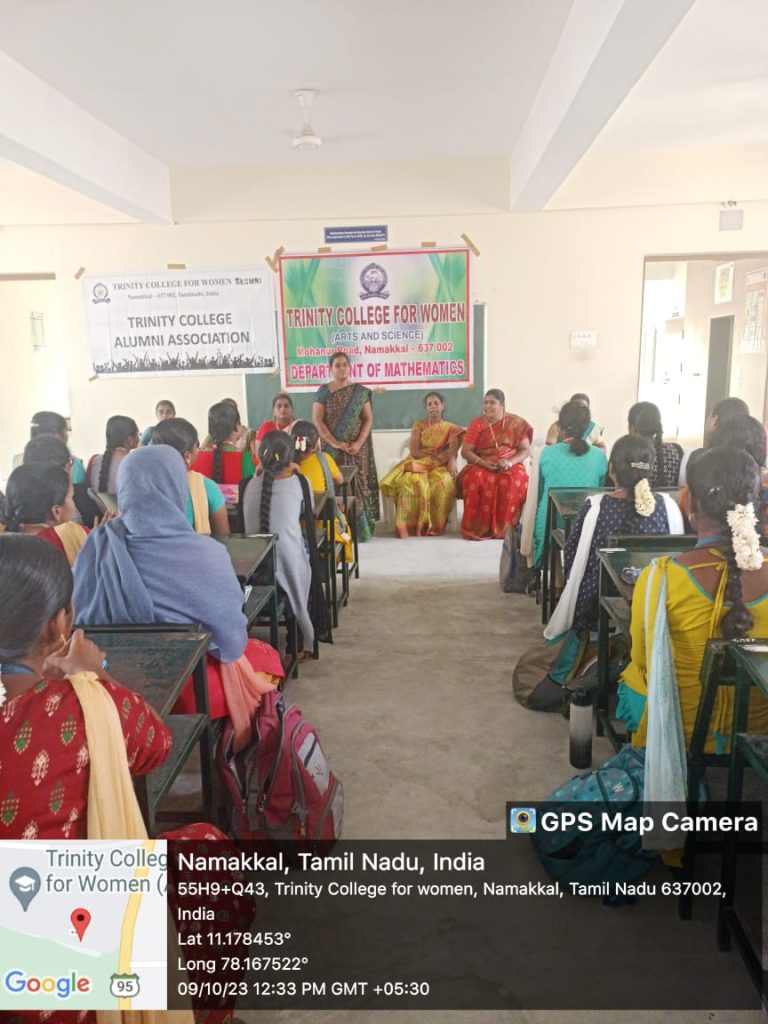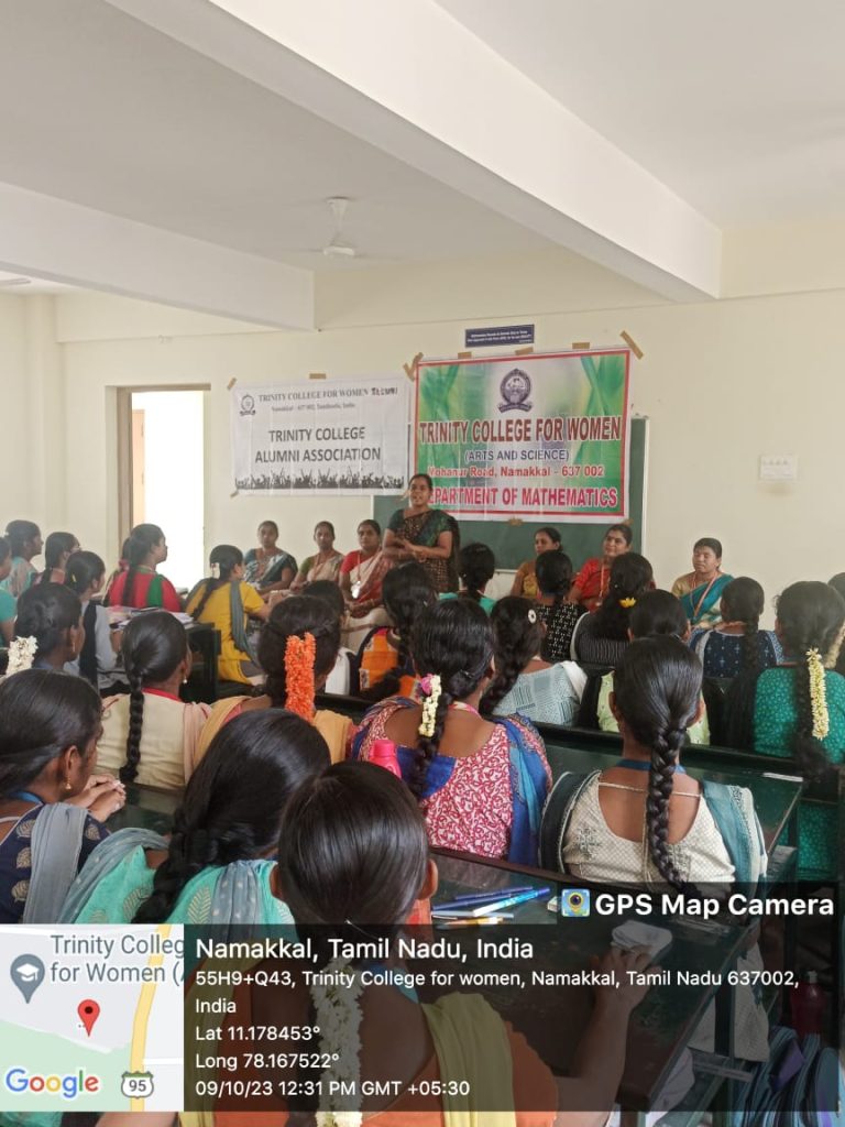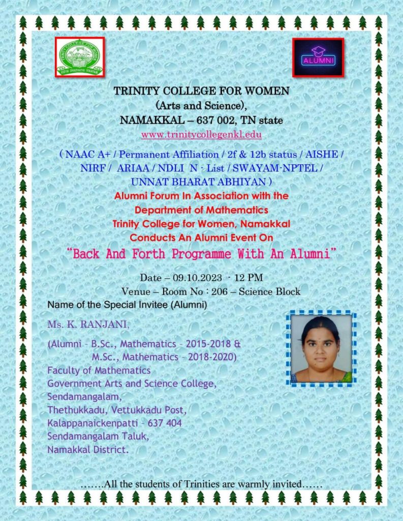 The Alumni Forum, in association with the department of mathematics at Trinity College for Women, Namakkal, conducted an alumni event entitled “Back and Forth Programme with an Alumni” on October 9, 2023, on the college campus.