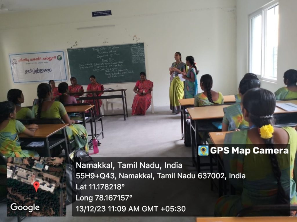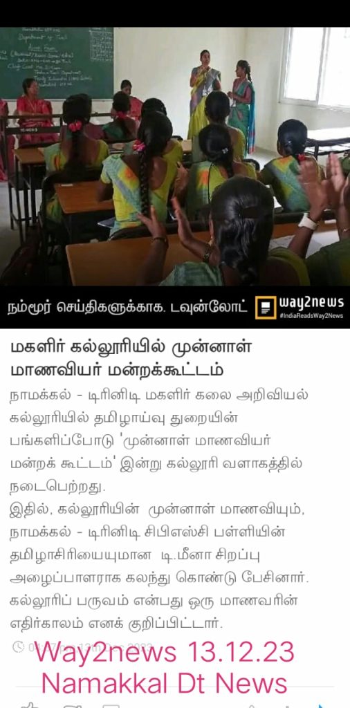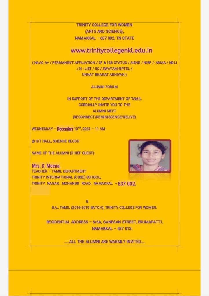 The Alumni Forum, in association with the department of Tamil at Trinity College for Women, Namakkal, conducted an alumni meet on December 13, 2023, in the science block of the college. The theme of the Alumni Meet was Reconnect, Reminisce and Relive.