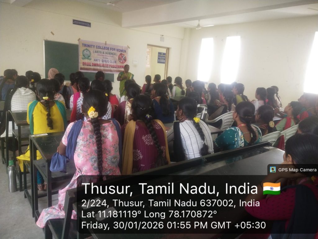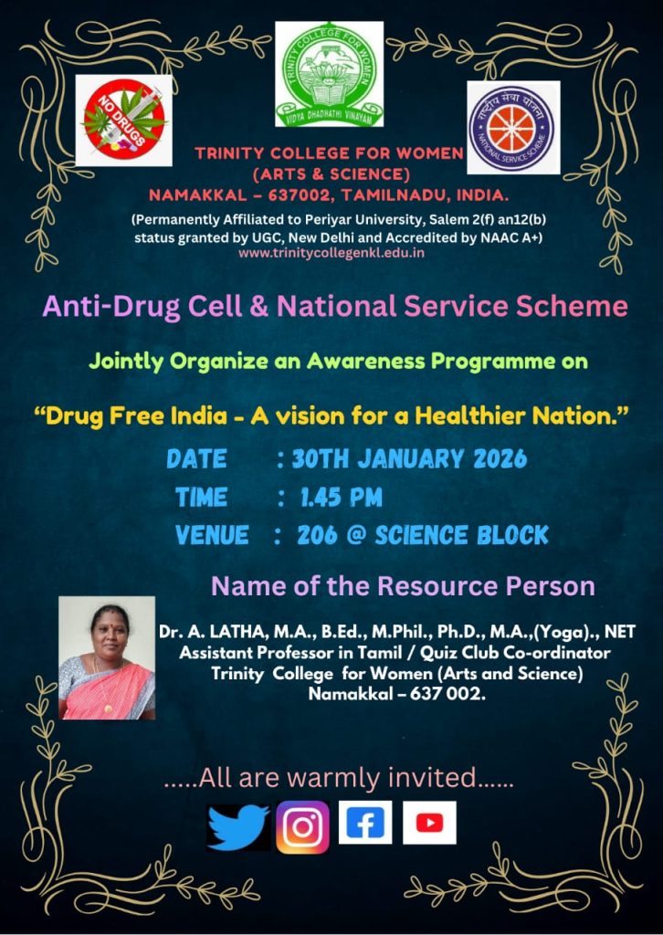 The Anti-Drug Club and National Service Scheme, Trinity College for Women, Namakkal, jointly conducted an awareness programme on “Drug Free India – A vision for a Healthier Nation” on 30th January 2026 (Friday) at 2 PM on our college campus.