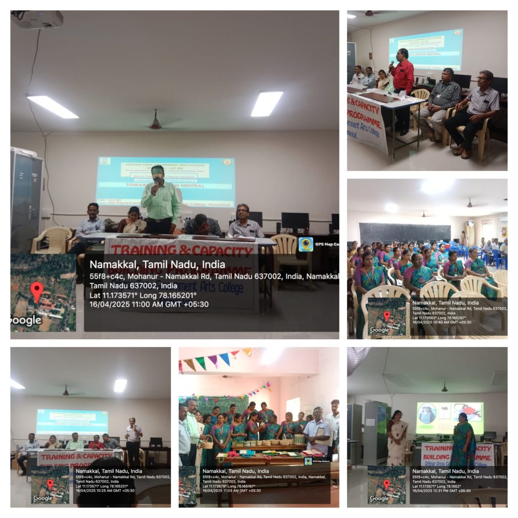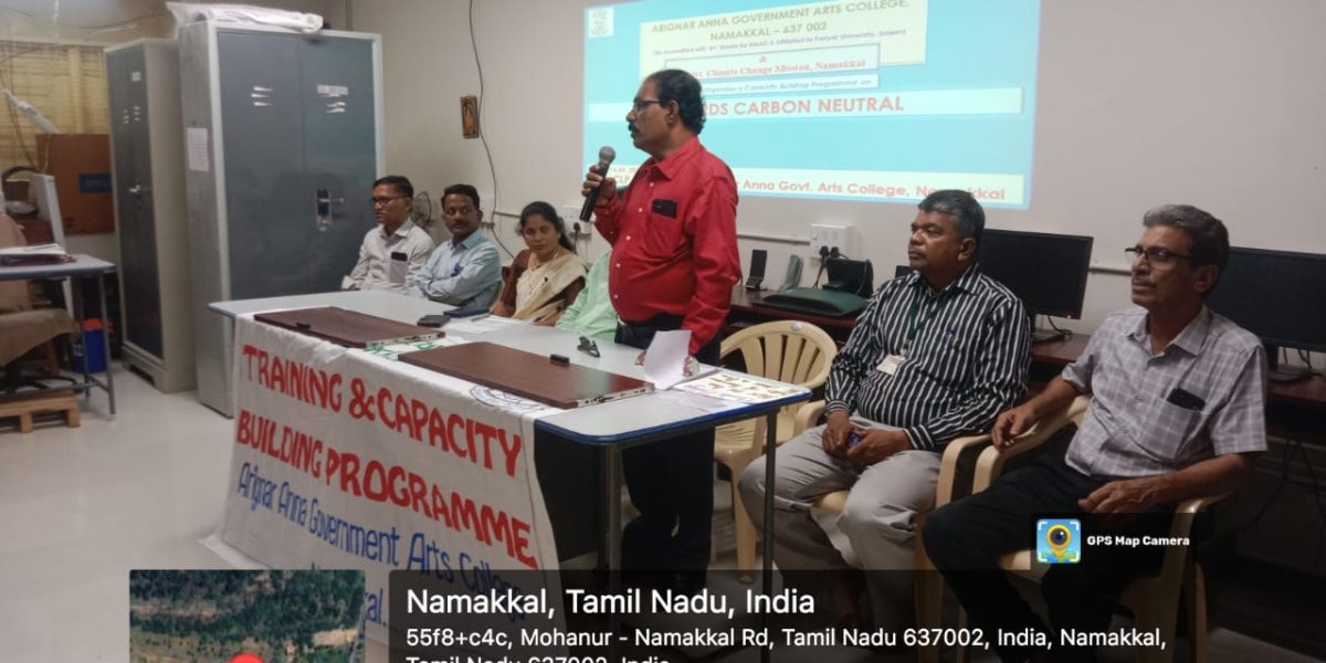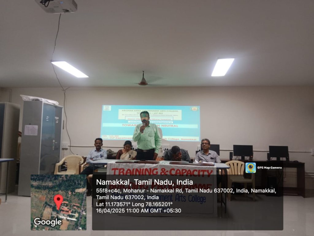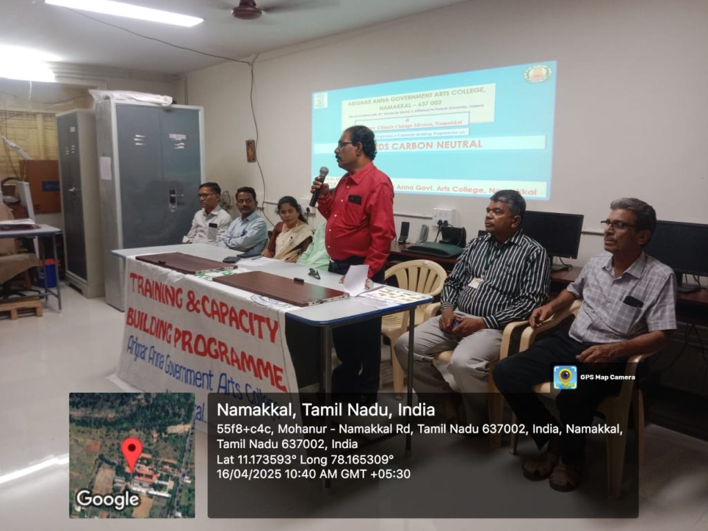 The Arignar Anna Government Arts College, Namakkal and District Climate Change Mission, Namakkal jointly organized a capacity-building programme titled “Towards carbon Neutral” for the benefit of faculty members of various higher educational institutions in and around Namakkal on 16th April 2025