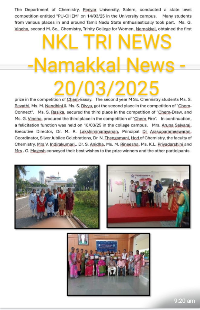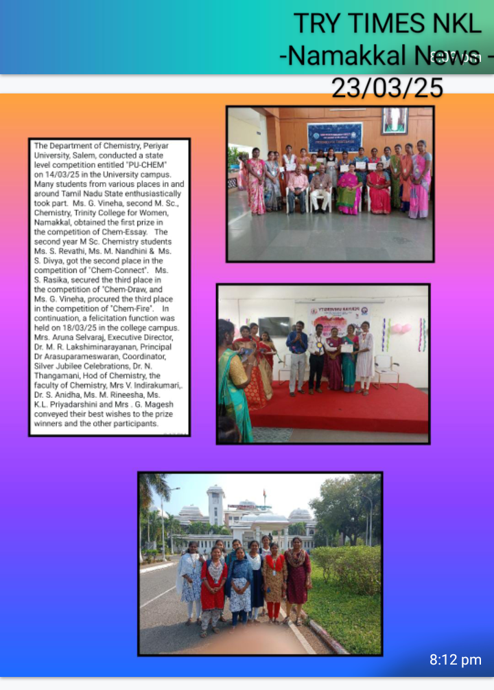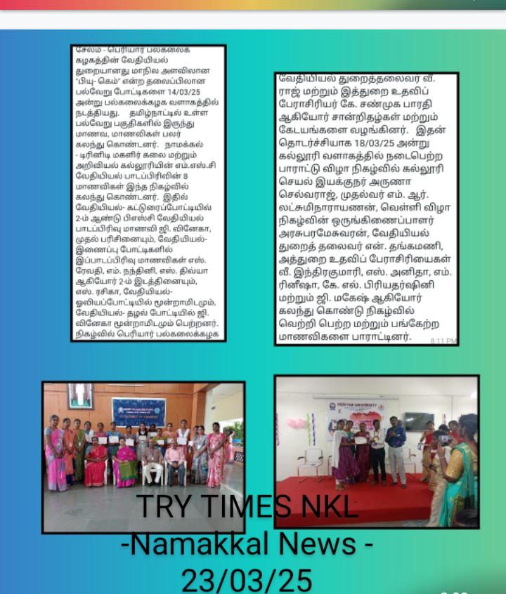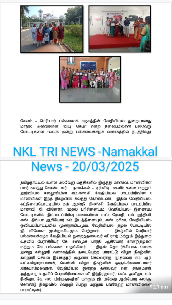 The Chem Club of Department of Chemistry, Periyar University, Periyar Palakalai Nagar, Salem conducted a one day state level programme titled “Molecules that inspire, reactions that thrill” (State Level – 4th PU CHEMFEST) on 14th March 2025
