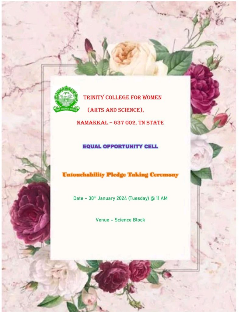 The coordinator of the Equal Opportunity Cell, Dr. R.A. Anitha, as well as students of Trinity College for Women, Namakkal, assembled in front of the science block at 11.30 AM on January 30, 2024, to observe two minutes of silence and take a pledge against untouchability