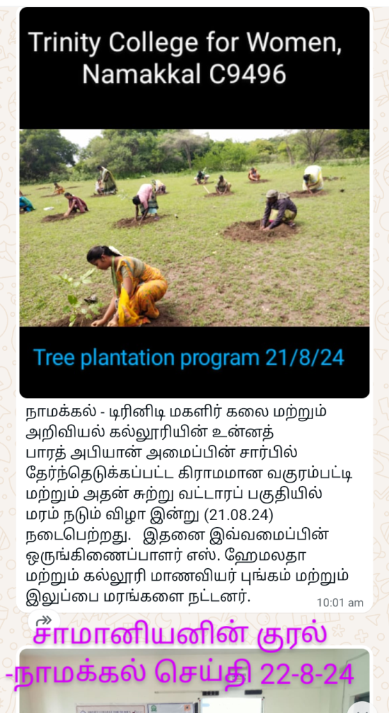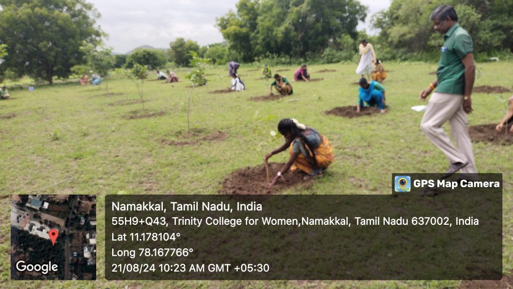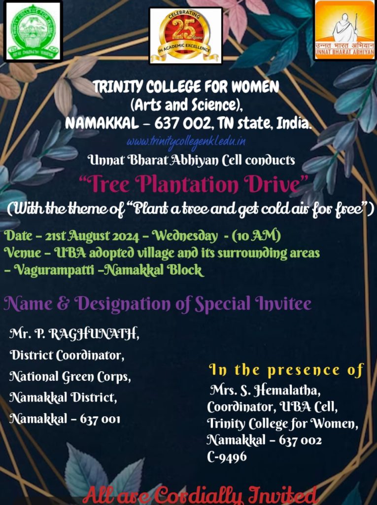 Service to humanity is service to God. Loving nature is loving god. The Coordinator of UBA Cell Mrs. S. Hemalatha and the volunteers of the UBA Cell, Trinity College for Women, Namakkal planted trees during the tree plantation drive in the UBA adopted village of Vagurampatti and its surrounding places on 21.08.24. Mr. P. Raghunath, District Coordinator, National Green Corps, Namakkal District, Namakkal was the special invitee. He emphasized the need for tree planting for our environmental protection.