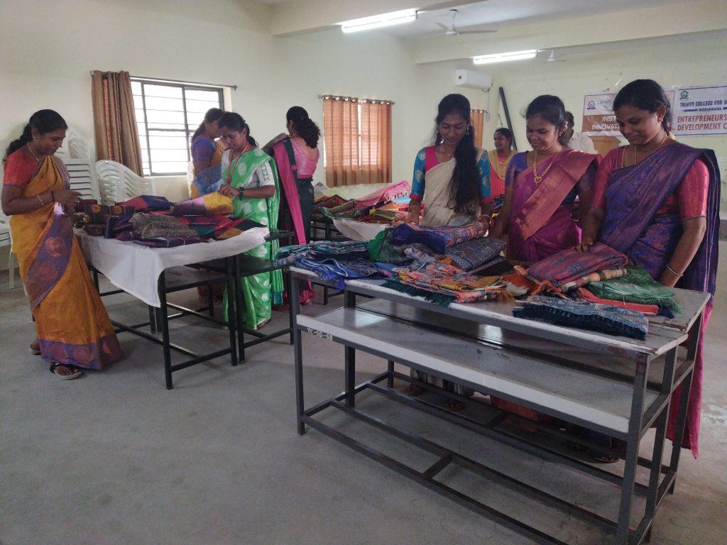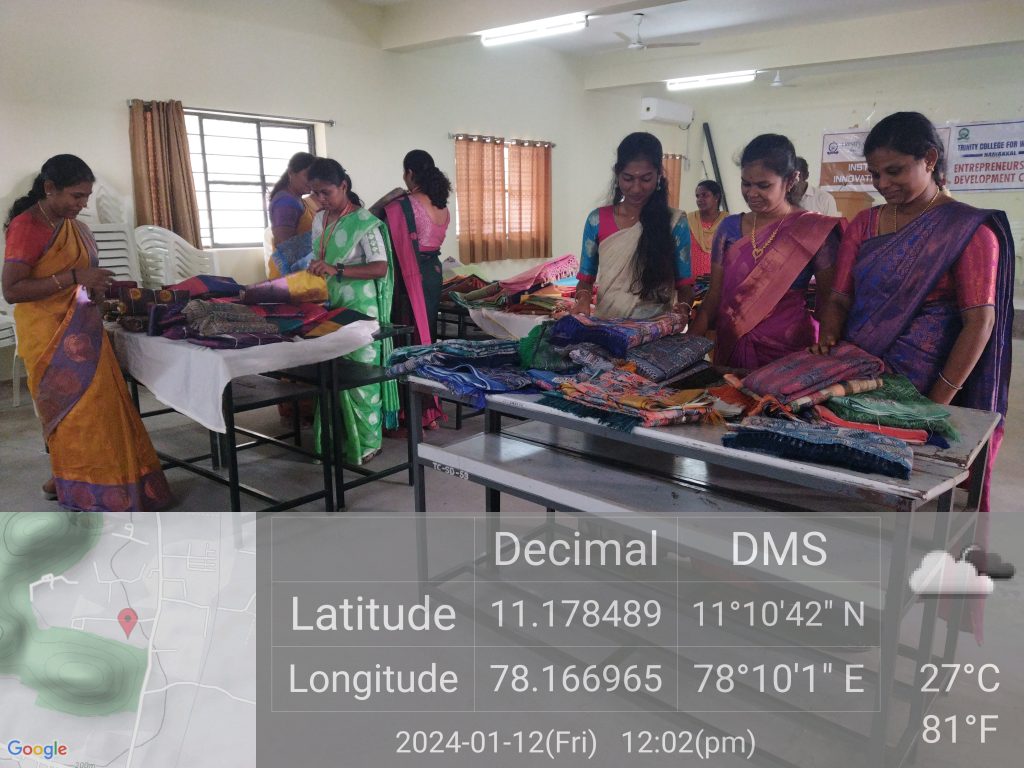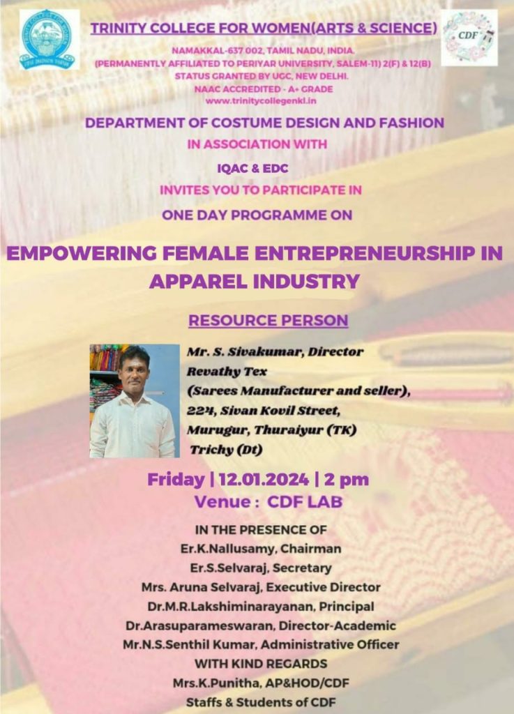 The Costume Design and Fashion, in association with the internal quality assurance cell and Entrepreneurship Development Cell, Trinity College for Women, Namakkal, conducted a one-day programme entitled “Empowering Female Entrepreneurship in the Apparel Industry on January 12, 2024, on the college campus. Mr. S Sivakumar, Director, Revathy Tex (Sarees Manufacturer and Seller), 234, Sivan Kovil Street, Murugur, Thuraiyur Taluk, Tiruchirappalli District, was the special invitee.