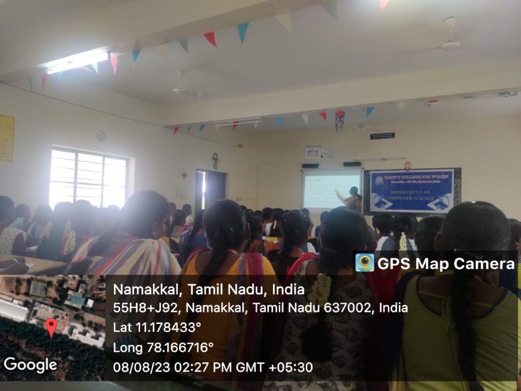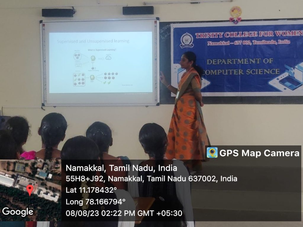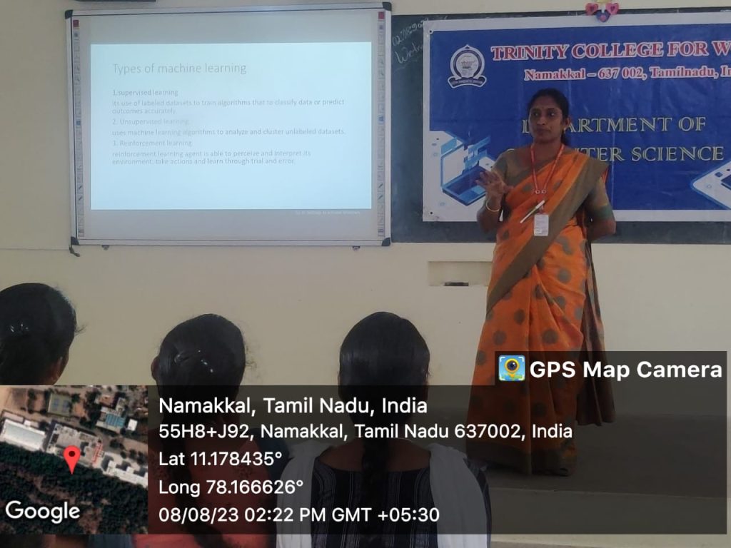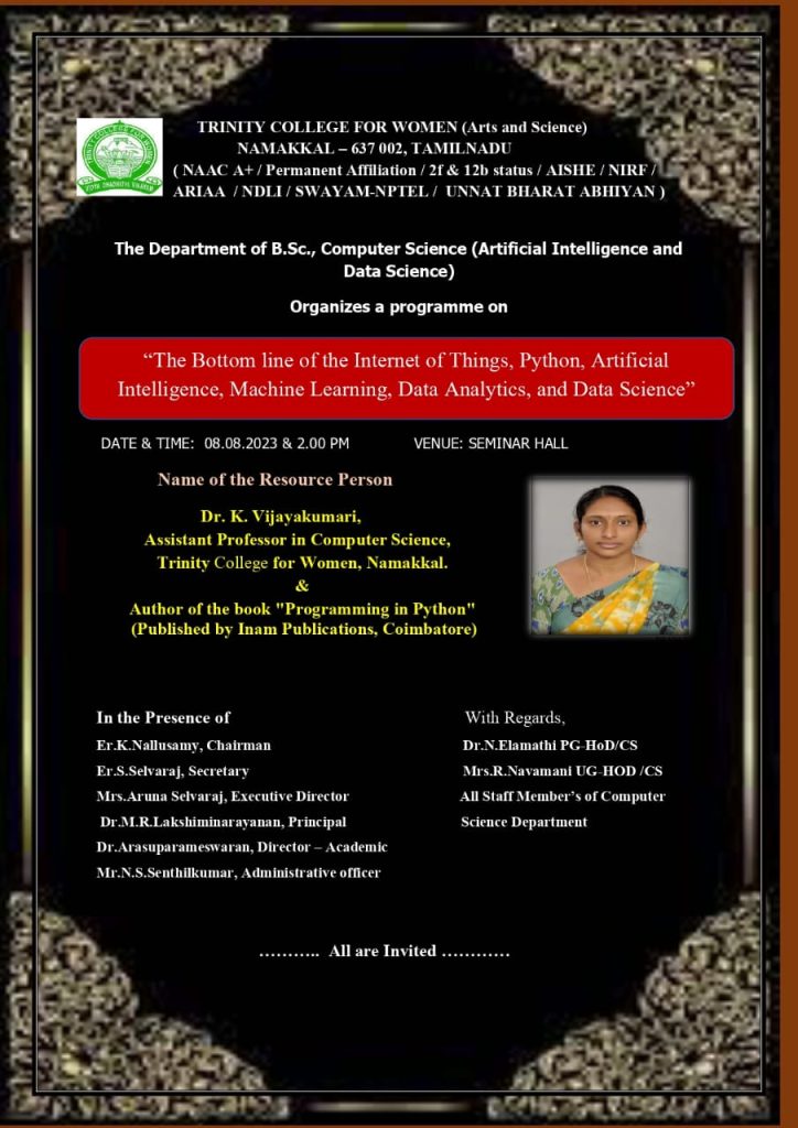 The department of B.Sc., Computer Science (Artificial Intelligence and Data Science) of Trinity College for Women, Namakkal, conducted a programme entitled “The Bottomline of the Internet of Things: Python, Artificial Intelligence, Machine Learning, Data Analytics, and Data Science” on August 8, 2023, in the ICT Hall of the Computer Science department.