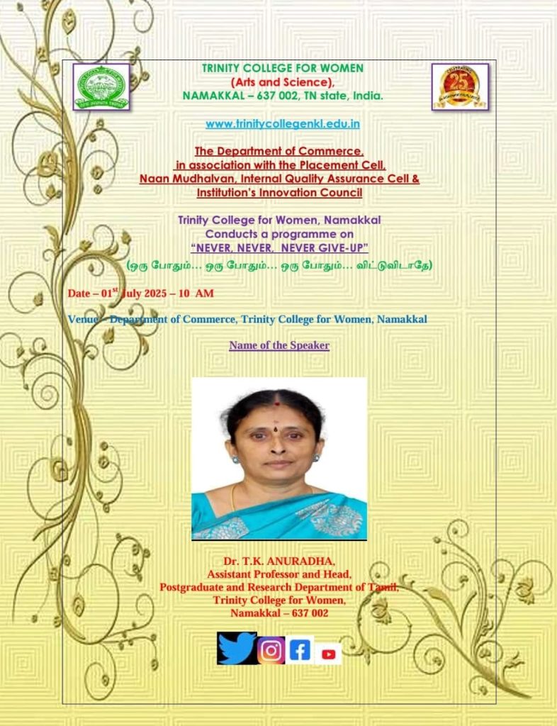 The Department of Commerce, in association with the IQAC, IIC, Placement Cell and Naan Mudhalvan, Trinity College for Women, Namakkal organized a programme titled “Never, Never, Never Give-up” (ஒரு போதும்……. ஒரு போதும்……. …… ஒரு போதும்……. .விட்டுவிடாதே) on 01st July 2025.