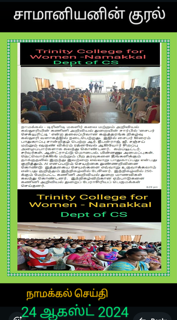 The Department of Computer Science, Trinity College for Women, Namakkal, conducted a one-day program titled “Secure Your Digital Future” on August 23, 2024 in the College campus