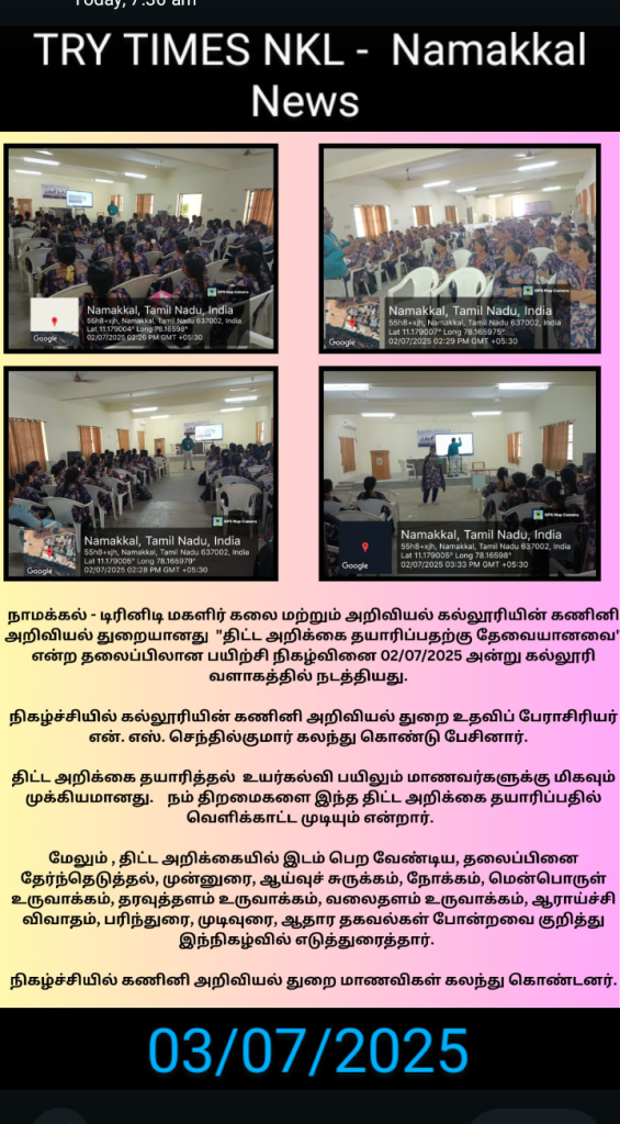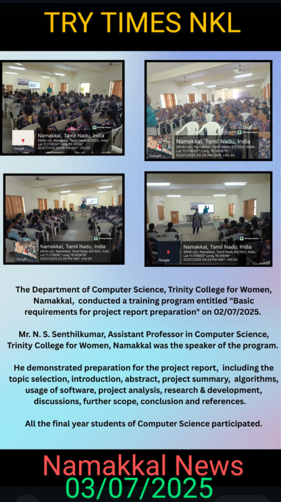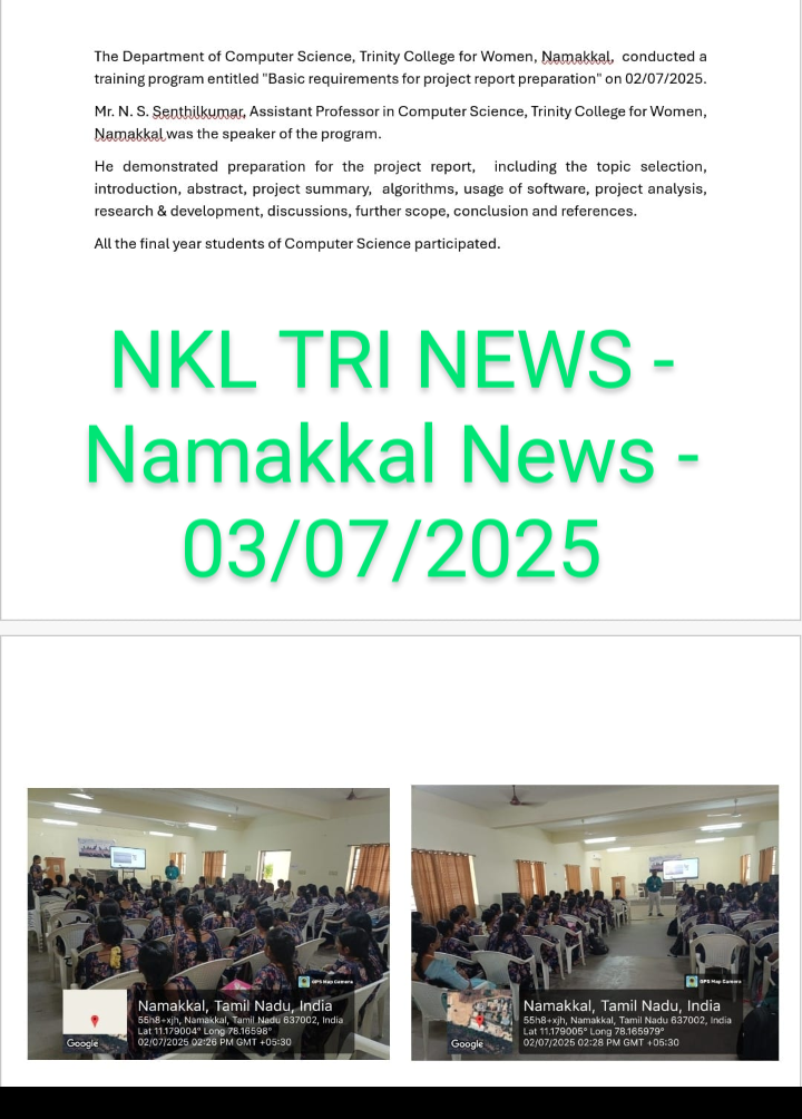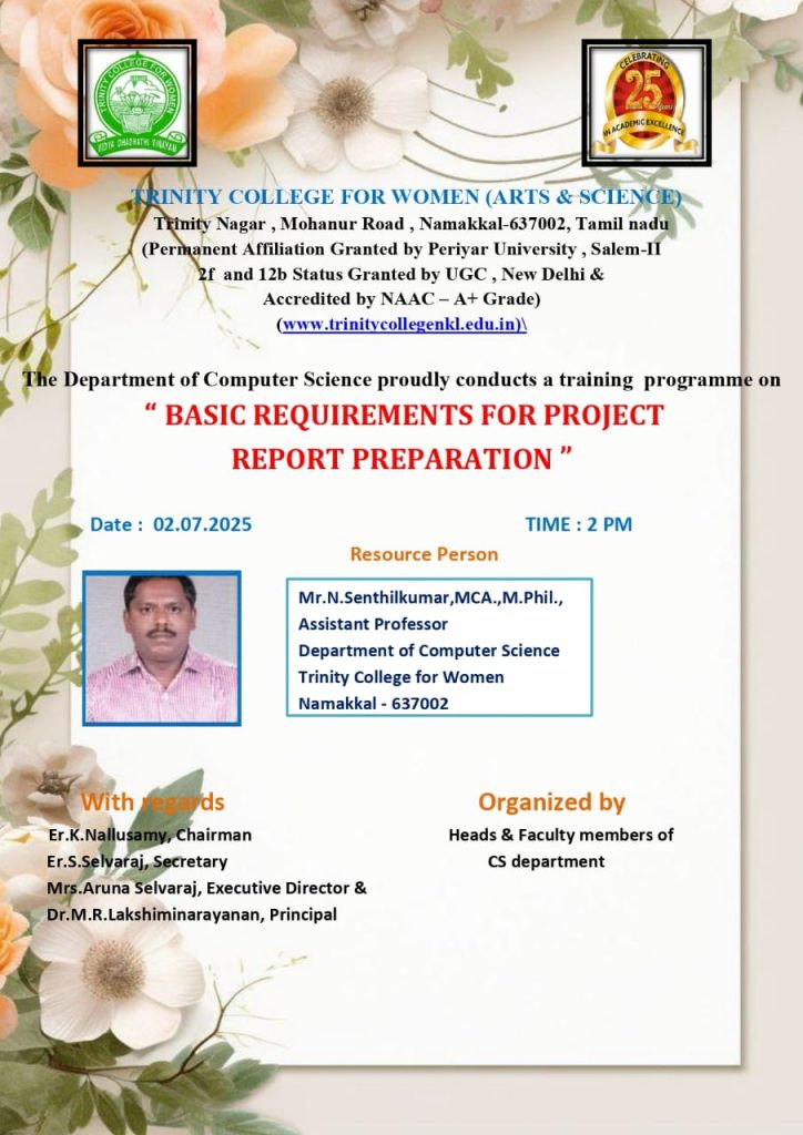 The Department of Computer Science, Trinity College for Women, Namakkal conducted a programme titled “Basic requirements for project report preparation” on 02nd July 2025 in the college premises.