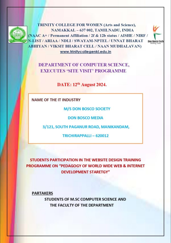 Web designing is the process of preparing and creating websites. It covers several different aspects, inclusive of web page, layout, content production, graphic design, etc., On this subject, for the purpose of creating practical knowledge about website development, the department of Computer Science, Trinity College for Women, Namakkal has arranged a field trip on 12th August 2024.