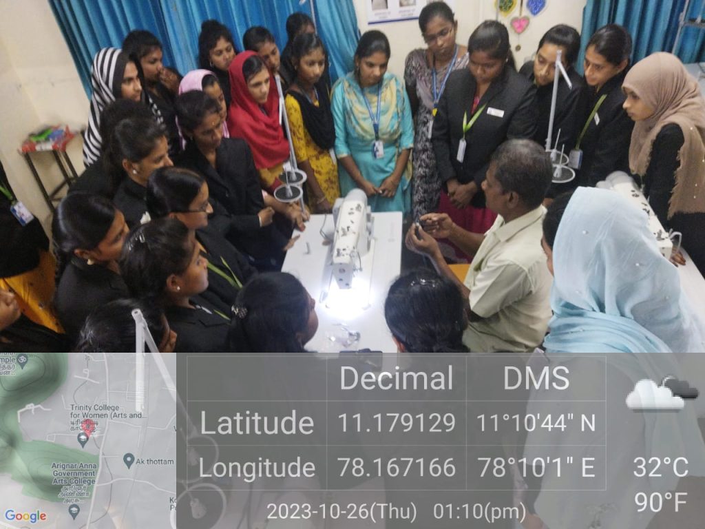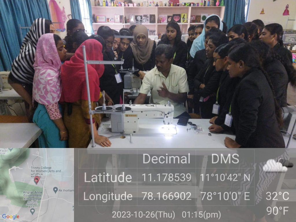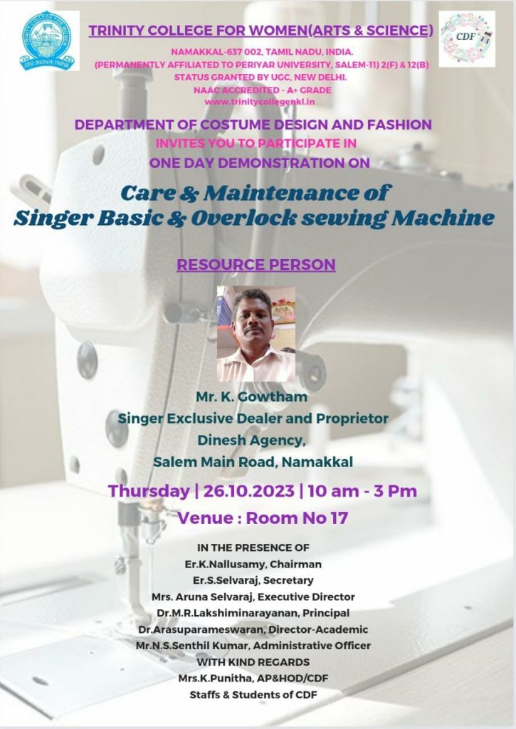 The Department of Costume Design and Fashion, Trinity College for Women, Namakakl, conducted a one-day workshop entitled “Care and Maintenance of Singer Basic and Overlock Sewing Machines” on October 26, 2023, in the CDF laboratory.