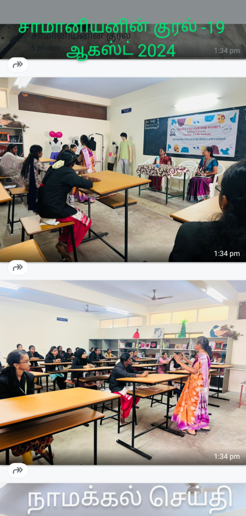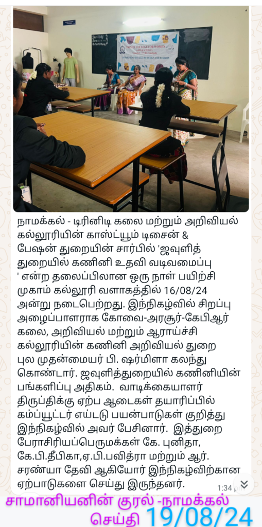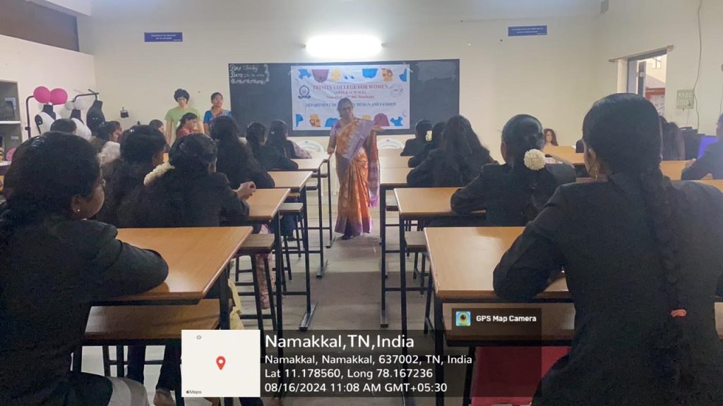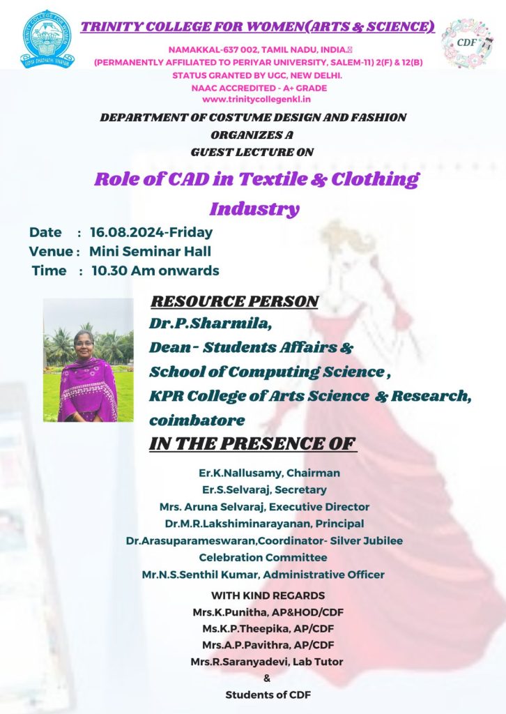 The Department of Costume Design and Fashion, Trinity College for Women, Namakkal conducted a one day programme titled “Role of CAD in Textile and Clothing Industry” on 16th August 2024. Dr. P. Sharmila, Dean, Student- Affairs, School of Computer Science, Avinashi Road, Arasur, Coimbatore, was the special invitee. She highlighted the features of CAD and related designing tools which are widely used in the textile industry. Also, she demonstrated the Computer Aided Design programs like AutoCAD, Corel Draw, Photoshop, Lectra, Etc,