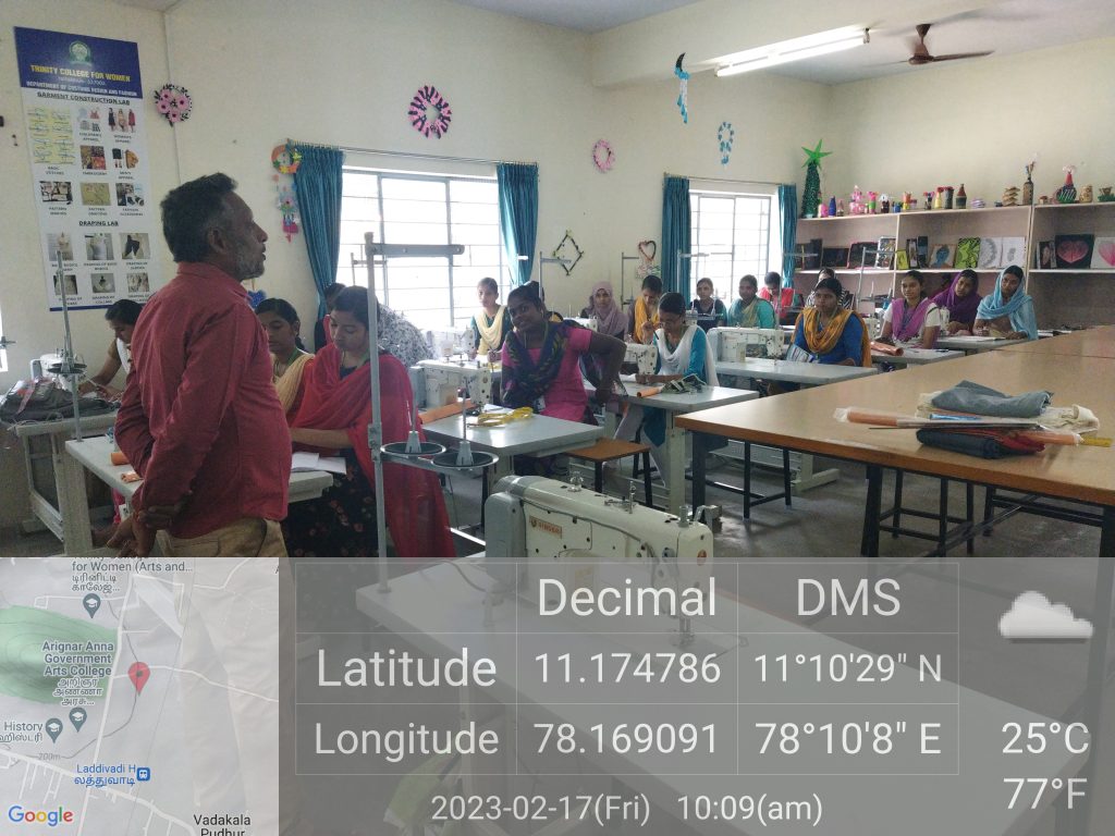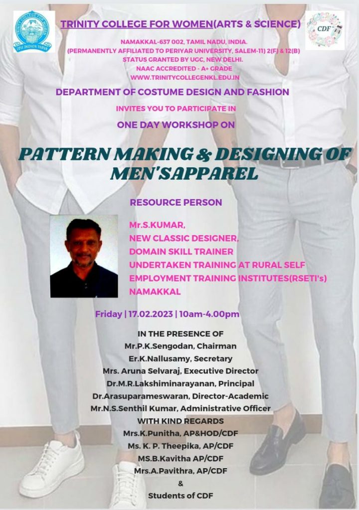 The Department of Costume Design and Fashion, Trinity College for Women, Namakkal organized a one day workshop entitled “Pattern making and designing of men’s apparel” on 17th February 2023 in the laboratory of CDF.