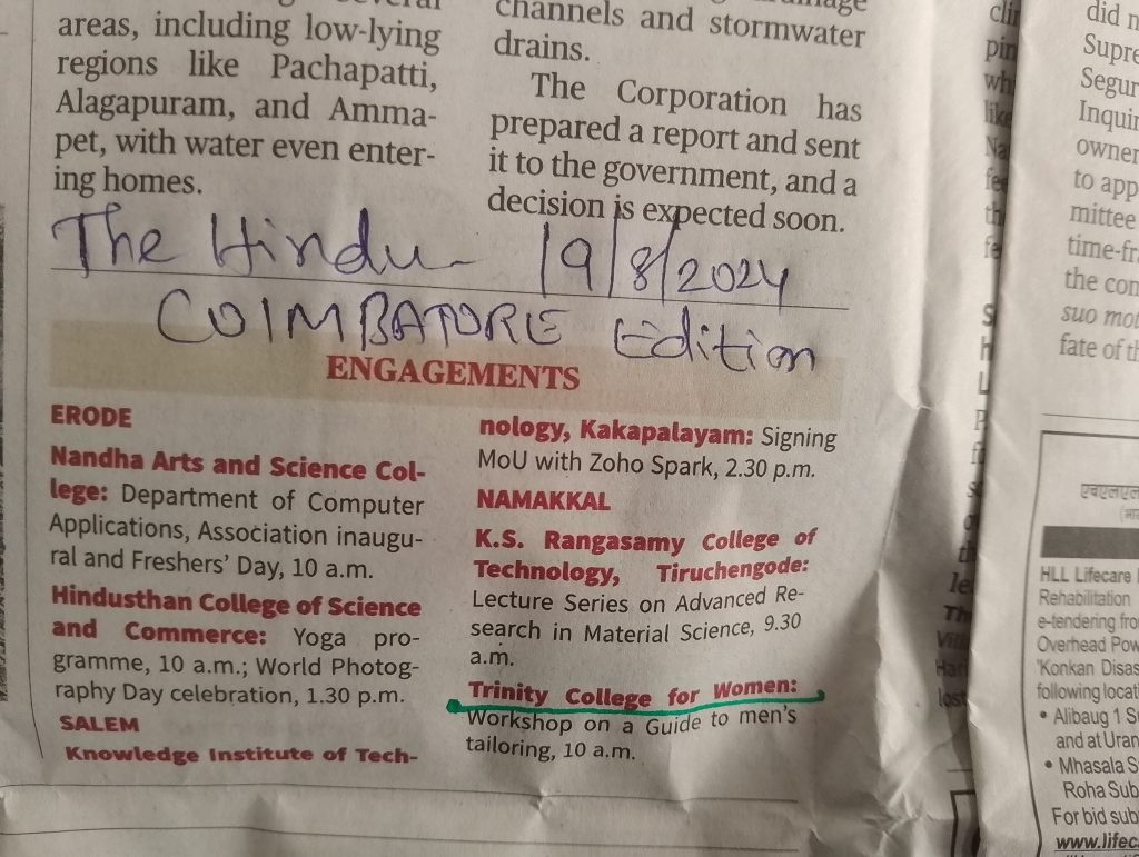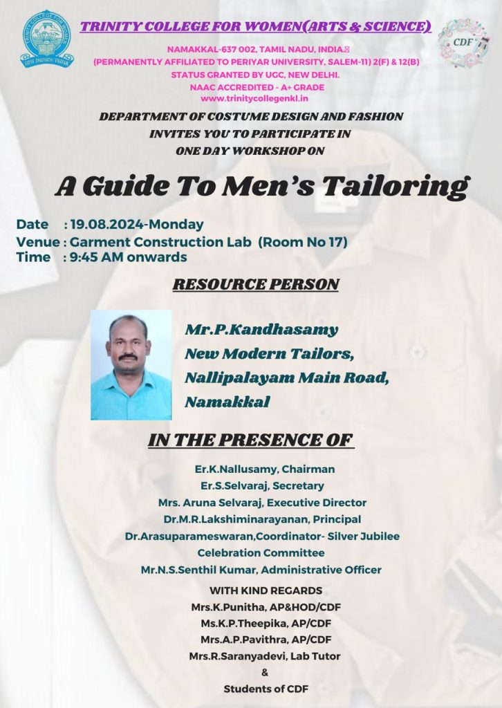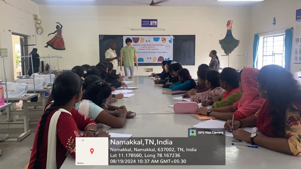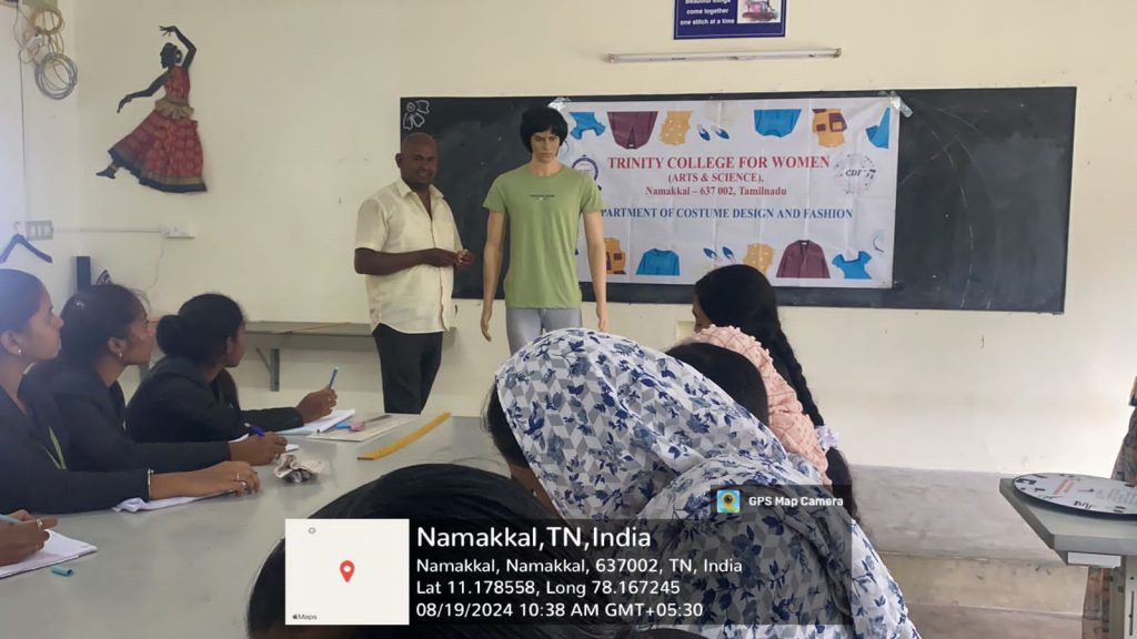 The Department of Costume Design & Fashion Design, Trinity College for Women, Namakkal organized a one day workshop entitled “A guide to men’s tailoring” on 19th August 2024. It was held in the venue of the CDF Laboratory.
