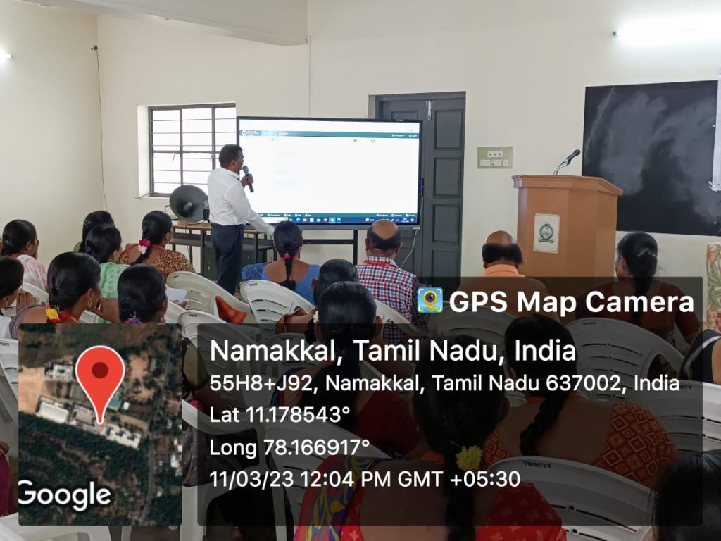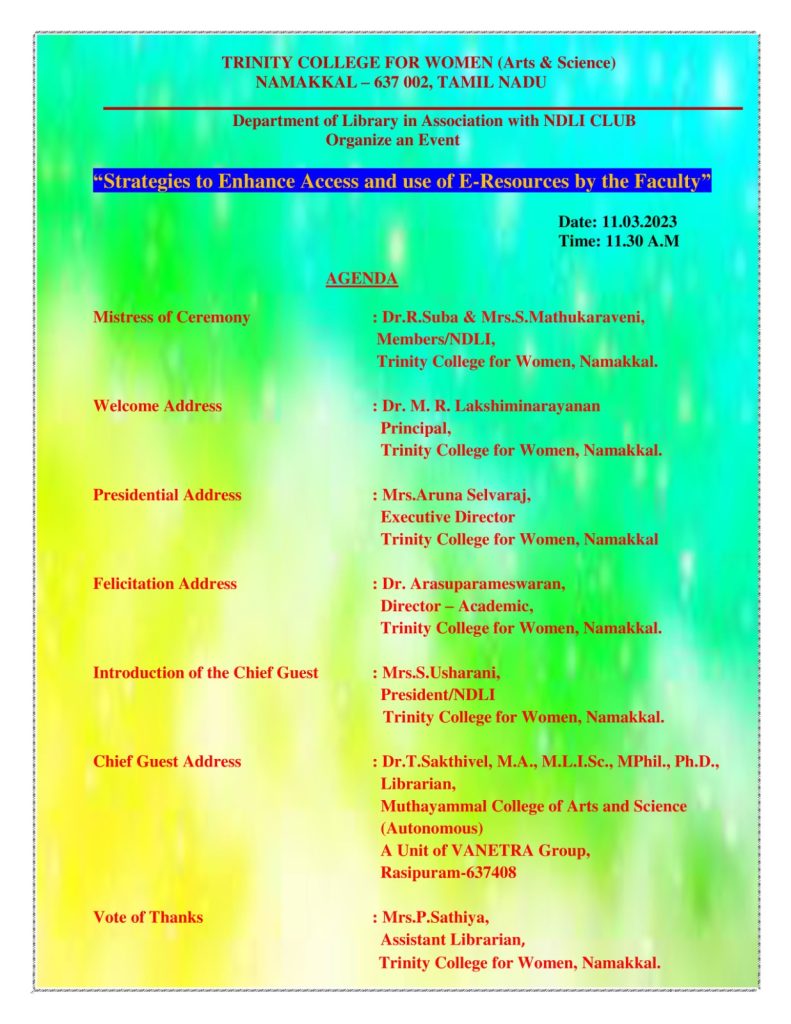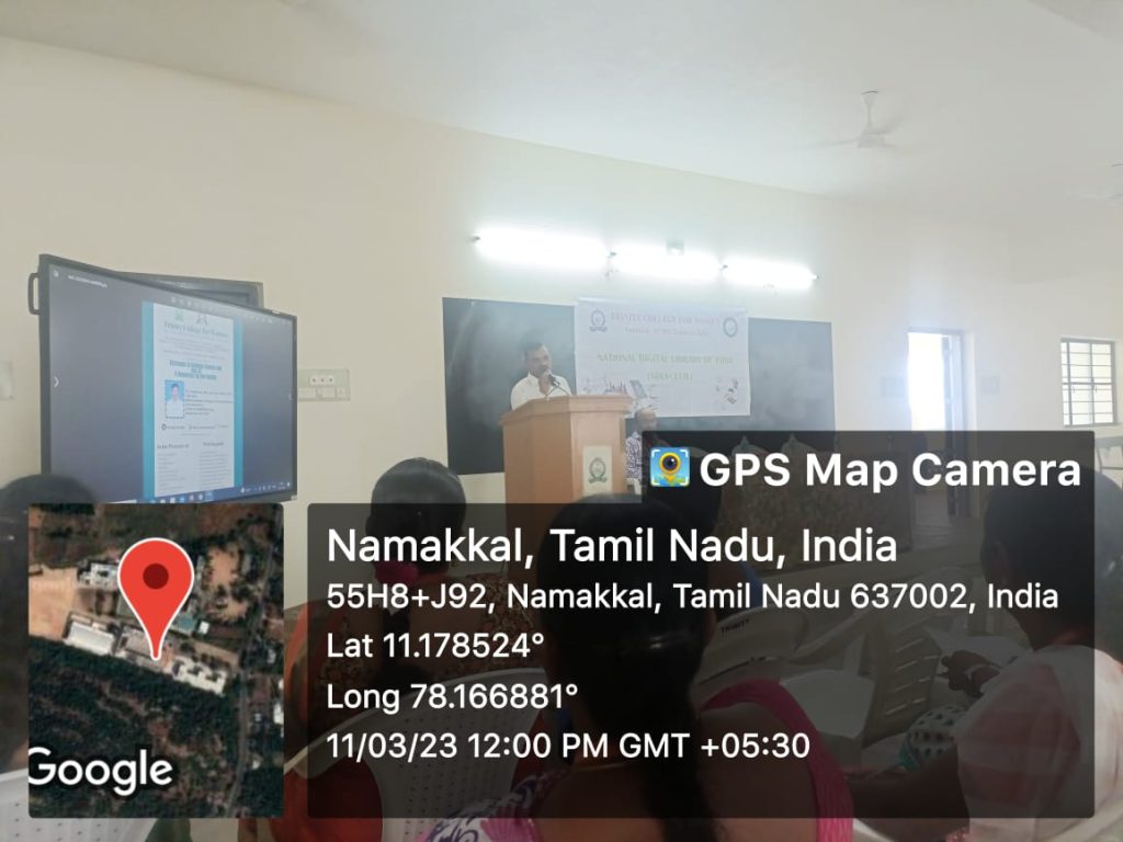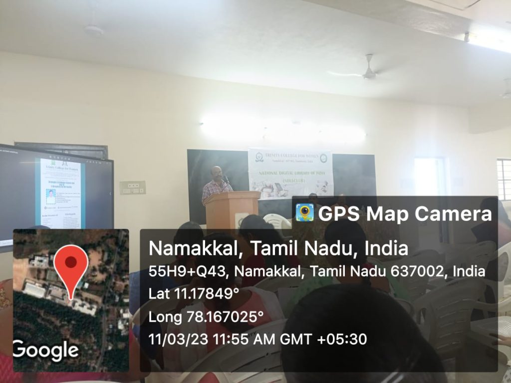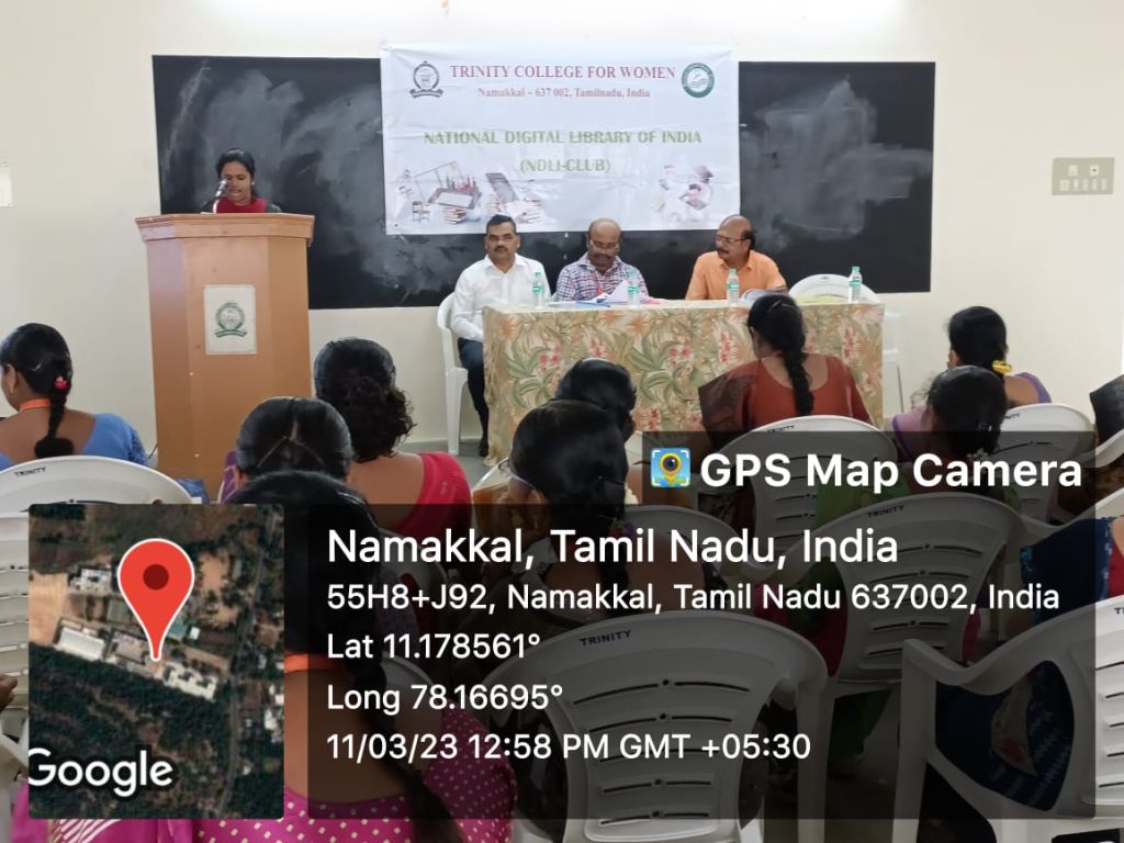 The Department of Library in association with National Digital Library India Club of Trinity College for Women, Namakkal conducted a one day programme entitled “Strategies to enhance access and use of E-Resources by the faculty” on 11.03.2023. It was held in the college premises. Dr. T. Sakthivel, Librarian, Muthayammal College of Arts and Science (Autonomous), A Vanetra Group of Educational Institutions, Rasipuram was the special invitee.